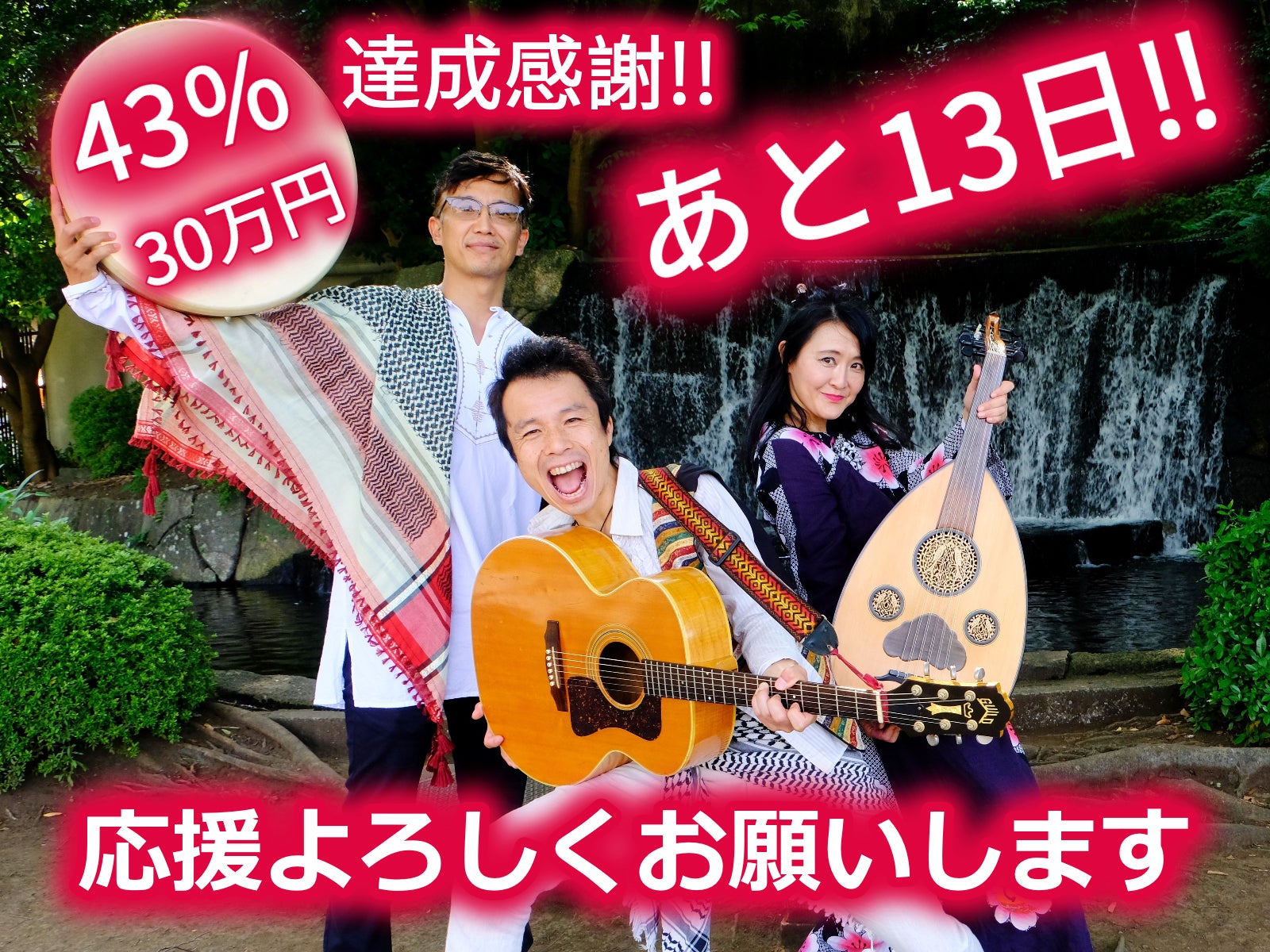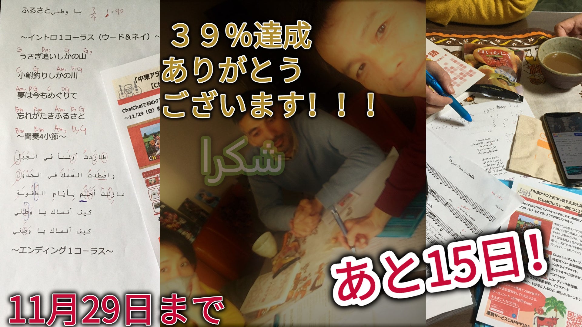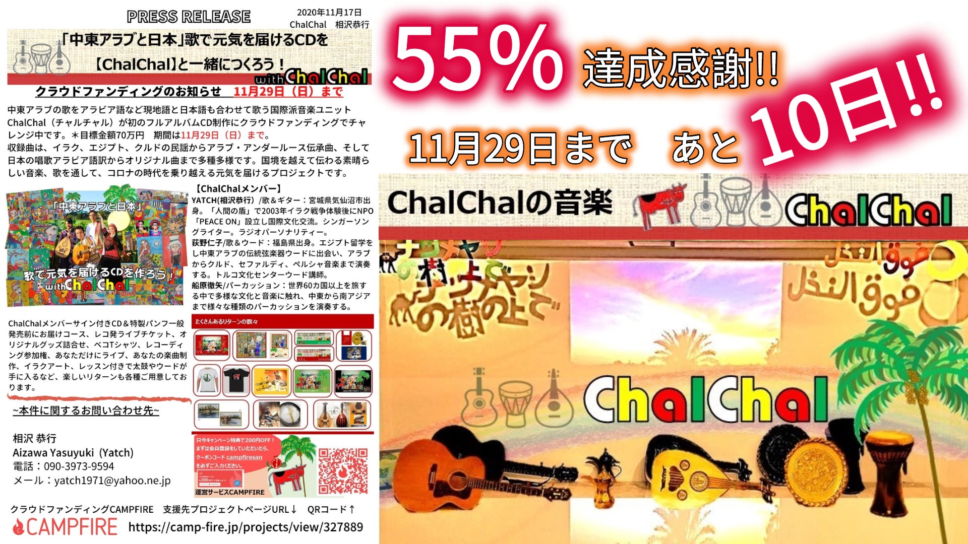 今日(11月18日)は6人の方からご支援いただき55%(およそ40万円)達成いたしました!ありがとうございました!昨日は限定1名様のレアリターン「イラン製ダフ+個人レッスンコース」が出まして、イランはじめ中東の人々への想いあふれるメッセージもいただき胸が熱くなりました。今回のCD収録曲にはトルコ東部デルスィム地域の伝統歌(ザザ語) 「エルカジエ」も入りますが、このステキな歌を知り演奏できるのはパーカッション船原さんと出会ったおかげです。すばらしいご縁に感謝!これでリターン「あなたの歌作りますコース」と「イラン製ダフ+個人レッスンコース」(各5万円)は全て売り切れになりました。他も3万円以上のリターンは在庫数が少ないので、ご検討中の方はどうかお早めにお願いします!【プレスリリース】プレスリリースをこちらのページに載せました。http://chalchal.html.xdomain.jp/Chalchal/ChalChal.pdf各メディアへの紹介ご協力していただけたら嬉しいです!【CD収録曲追加などおしらせ】★新たにアラブ・アンダルース伝承曲であるLamma Bada Yatathanna(ランマー・バダ―・ヤタサンナー)ChalChalでのタイトルは「愛ゆれる、その刹那」も収録曲に加わりました!★収録予定だった「コロナさんがやってきて」(オリジナル)は目標(70万円)達成できた場合ボーナストラックとしてCDにも収録されます。(いずれにしてもYATCHシングルとしては後日配信予定)【予定収録曲】*曲順未定・チャルチャル(ザクロの歌)/Chal Chal Alayea El Rumman (イラク)・太陽が昇る(ベコの歌)/Talaat Ya Mahla Nourha (エジプト)・ナツメヤシの樹の上で/Foug El-Nakhal (イラク)・愛ゆれる、その刹那/Lamma Bada Yatathanna(アラブ・アンダルース伝承曲)・手紙~エルカジエ/Elqajîye(オリジナル~トルコ東部デルスィム地域の伝統歌)・ふるさと/Ya Watani(唱歌アラビア語訳)・武器を花束に(宮城の詩人とのコラボ)・Everybody Sunshine(オリジナル)・役に立てなくてもいい(オリジナル)*CDのみボーナストラック「中東アラブと日本」歌で元気を届けるCDを【ChalChal】と一緒につくろう!55%達成感謝!期限の11月29日まであと10日です!!応援よろしくお願いします!!!