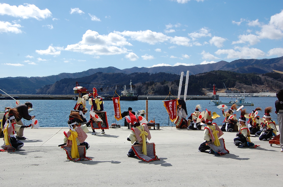 夕方、円満寺境内で郷土芸能を奉納します。漁港まで400人の灯ろう行列があり、漁船に積んだ灯籠を漁港内に流し、規模は小さいですが花火を打上げて、津波や戦争犠牲者、各家の先祖、魚類を含めた法界万霊の供養を行ってきました。死者を偲び、死者と共に生きる姿を鮮明にしているところが「三陸港まつり」の大きな特徴でもあります。