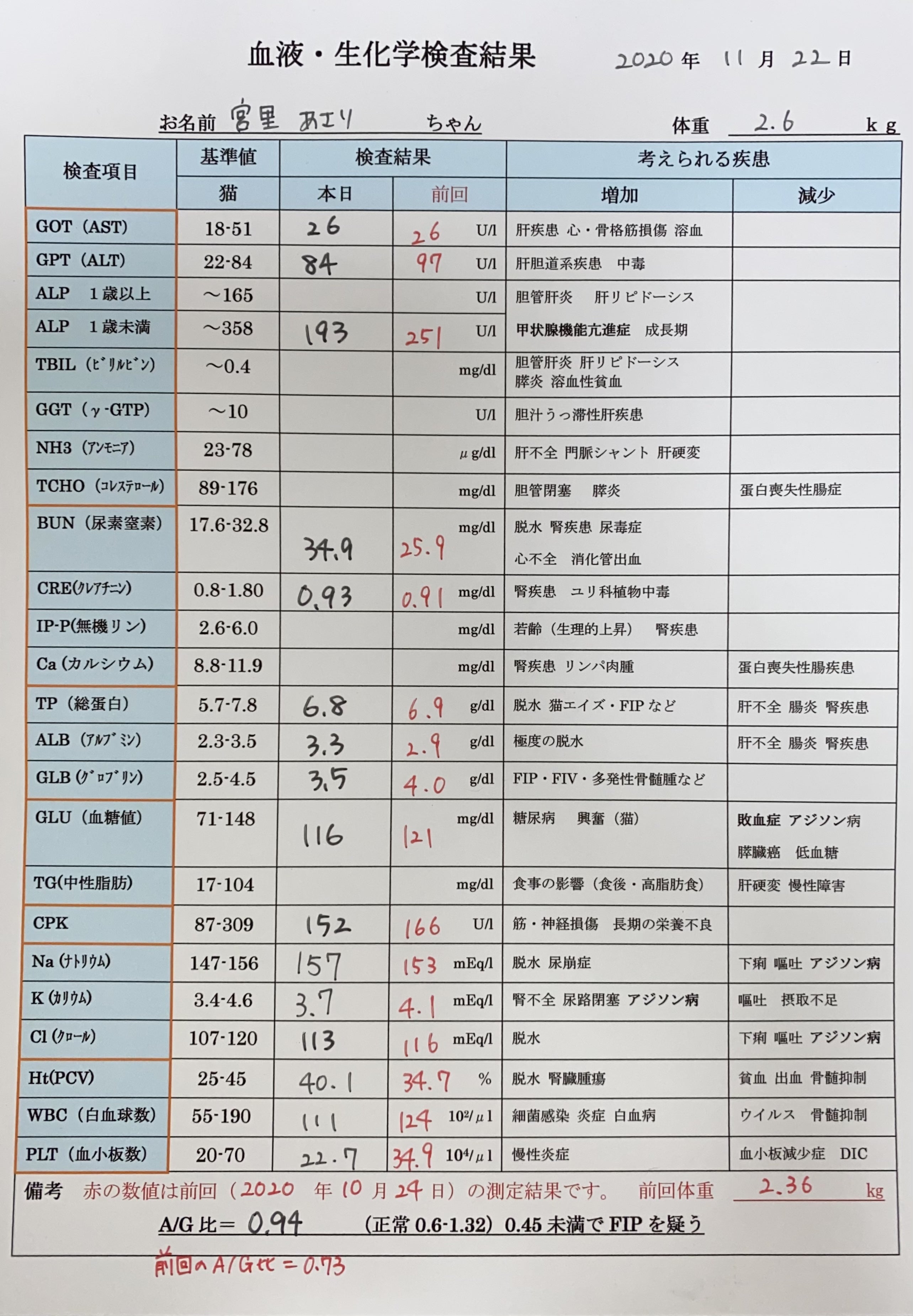 まずは院内血液検査。尿素窒素の項目が基準値より少し高いですが、これは鶏のささみやお肉系のご飯をよく食べる子が数値が上がるみたいで、最近新しいドライフードを試していて、ピュリナワンのチキン味を食べていたのでそれも影響しているのかなと思いました。その他は基準値内で、A/G比は0.94でした!
