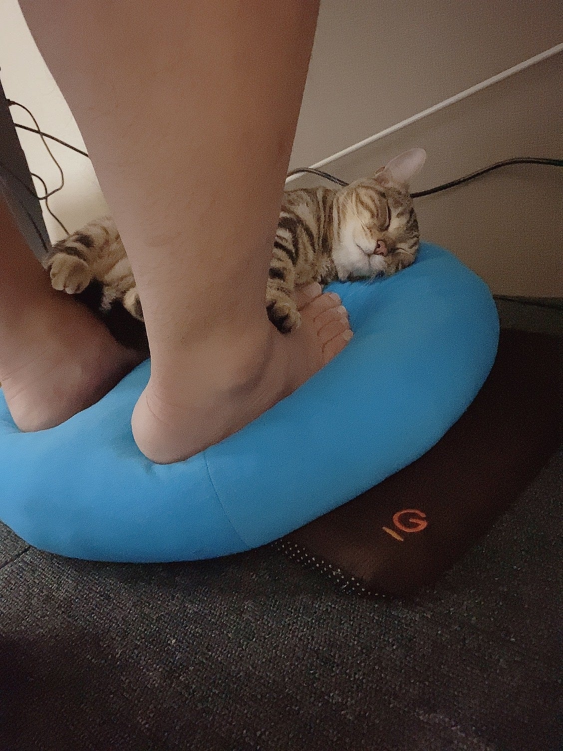 何故か作業中の夫の足元でくつろいでいるあさり。