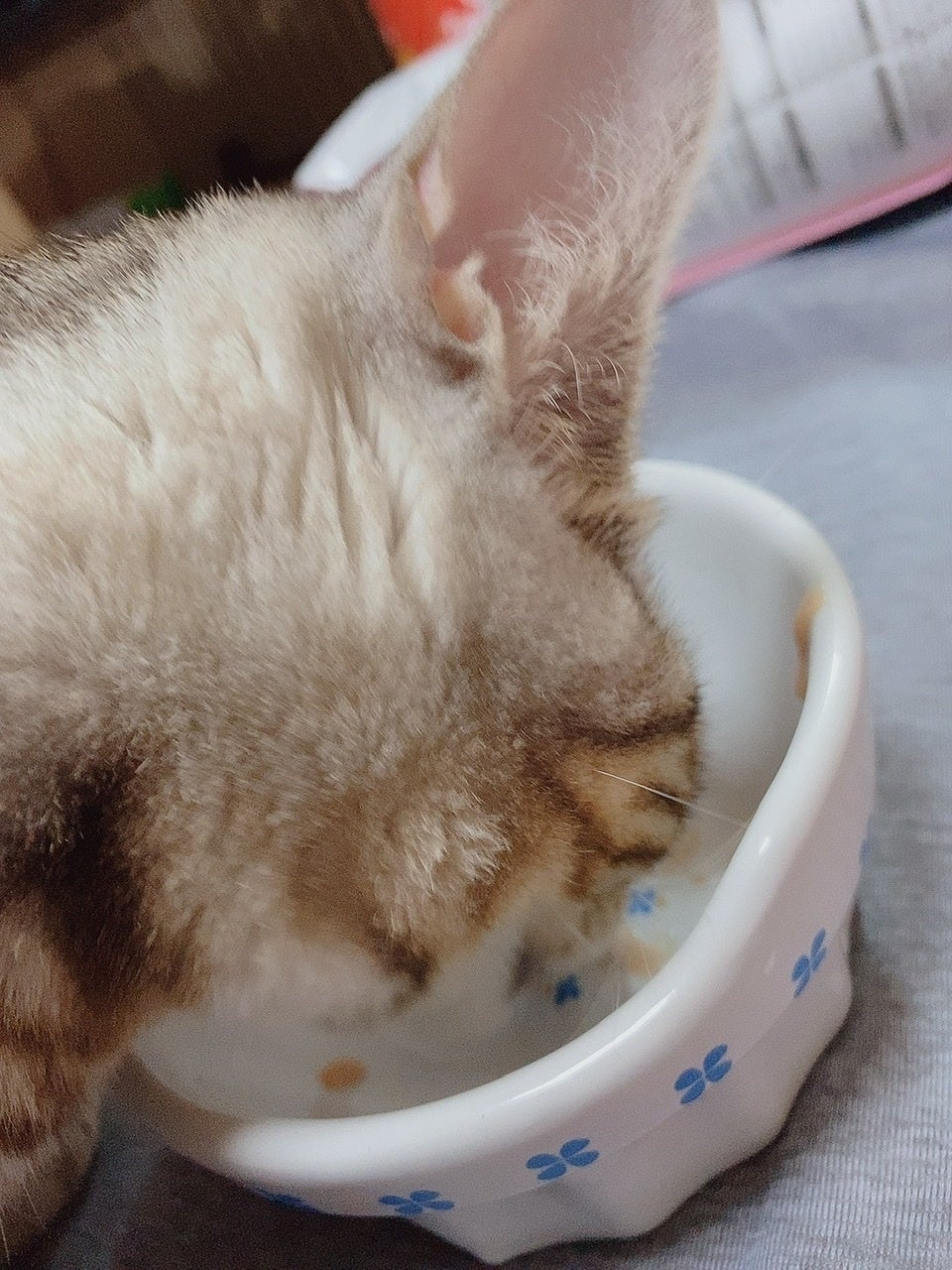 お薬投薬後のご飯とちゅ〜る(*ˊ˘ˋ*)この写真の後、空になったお皿をぺろぺろし続ける食いしん坊なあさりでした(笑)そう言えば最近親離れをしたのか毛布ふみふみを見かけなくなりました。何だか嬉しいような、寂しいような。。複雑な気持ちです( ˊᵕˋ ;)