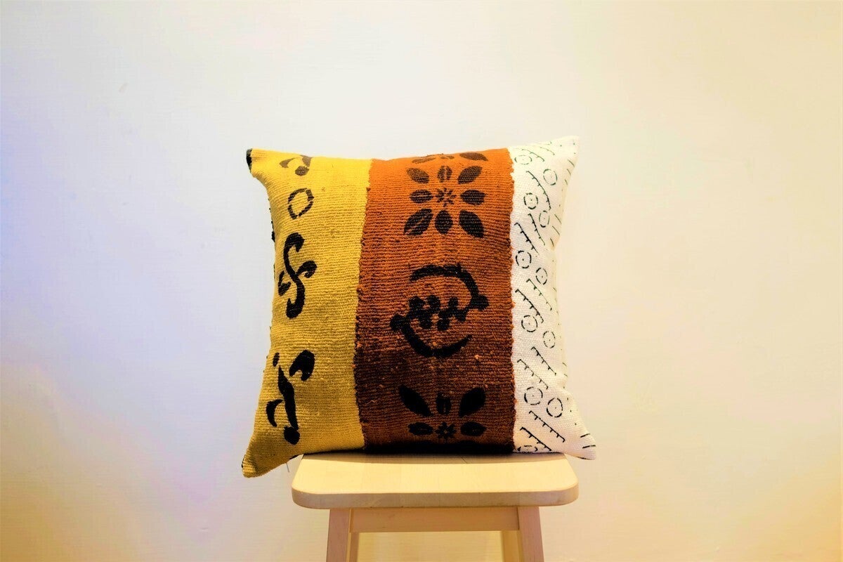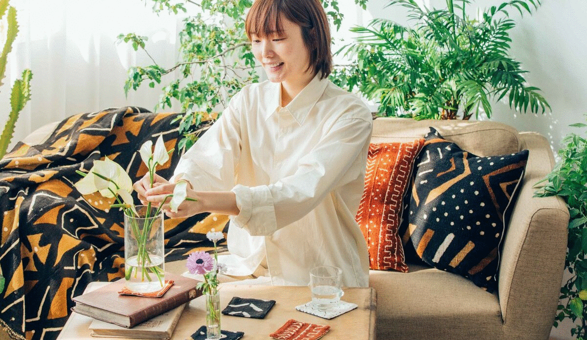 マリ産の天然素材を使って、現地の職人が原料から糸を撚り、手織りし、染色しました。出来上がった生地はアジアを代表する台湾のデザイナー、shen yao(シェンヤオ)氏によって、柄を組み合わせ、オリジナルのクッションカバーに一つ一つ丁寧に仕上げました。