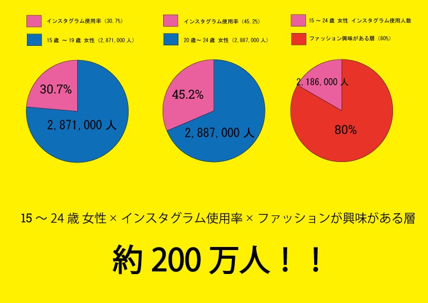 インスタグラムを使用している15~24歳までのファッションに興味のある女性は、最大約200万人います。しかし、もちろん最初からそこまでの多くのフォロワーは獲得できません。