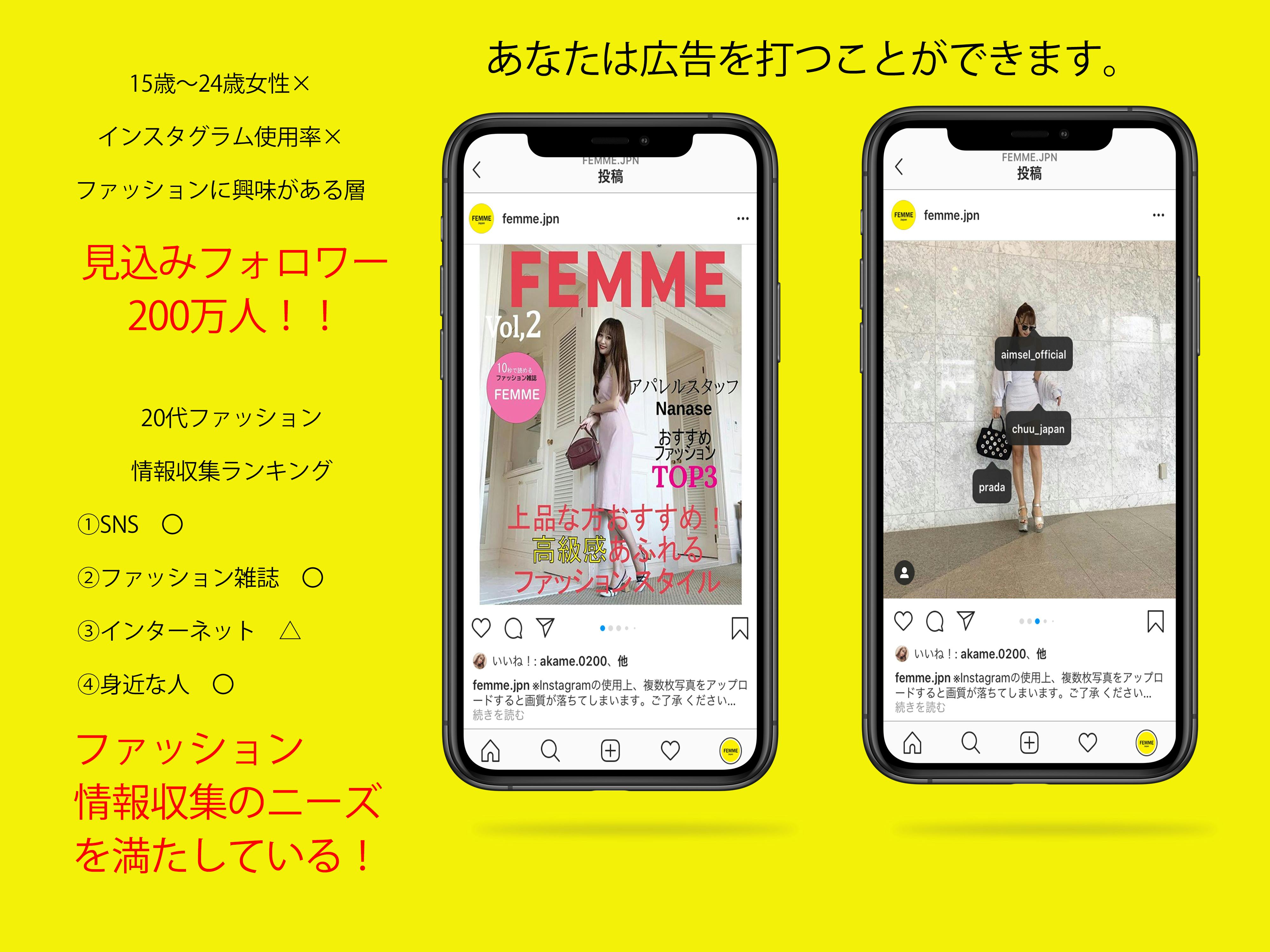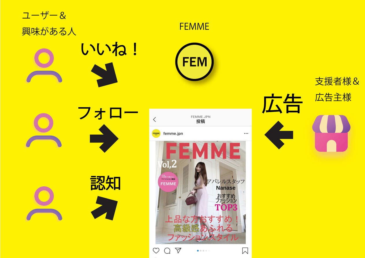 「FEMME」という名前で10代20代女性に向けてインスタグラムファッション雑誌を作り、事業者の集客問題を解決したい。