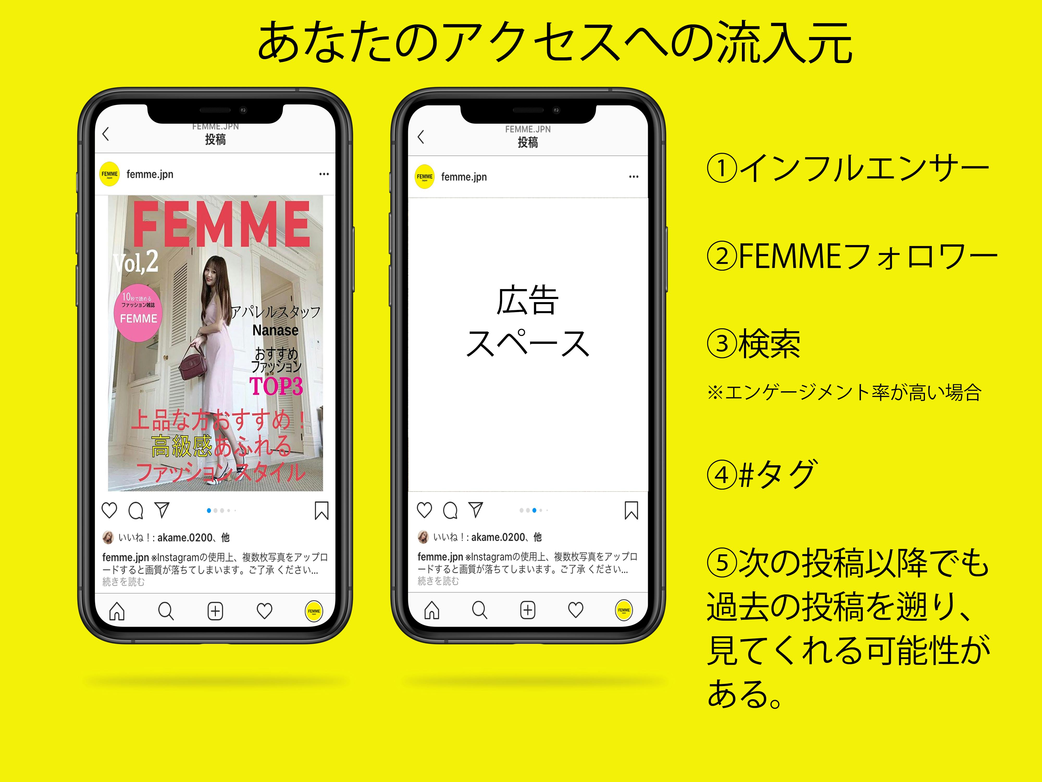 普通の広告と違うのは、通常の投稿なのでアーカイブに残ります。新規でFEMMEが興味を持ってくれた方が、過去をさかのぼって投稿を見てくれるかもしれません。