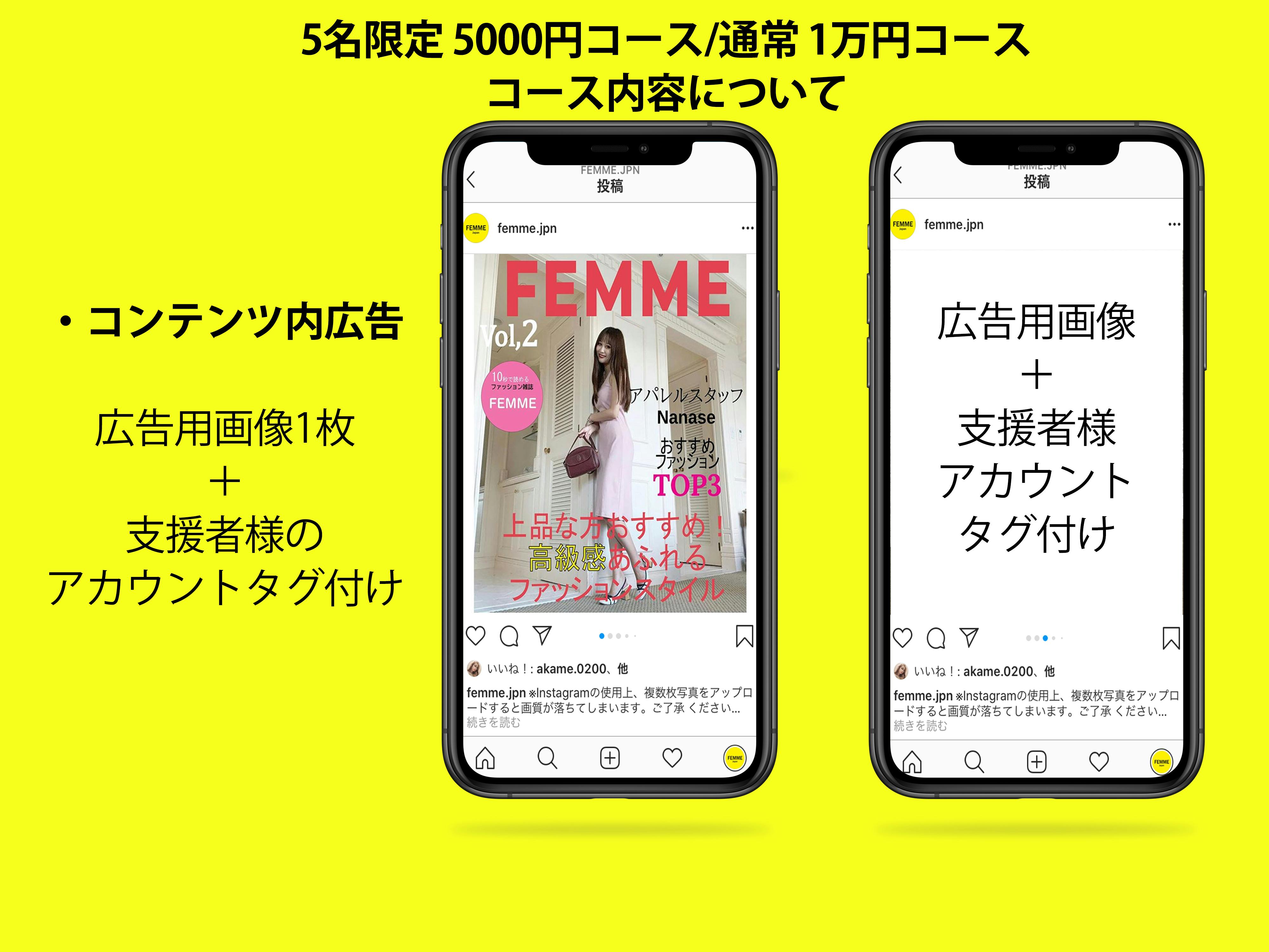 1、まず支援して下さったお金で、1万人以上フォロワーがいるインフルエンサー様とFEMMEがコラボさせていただきます。