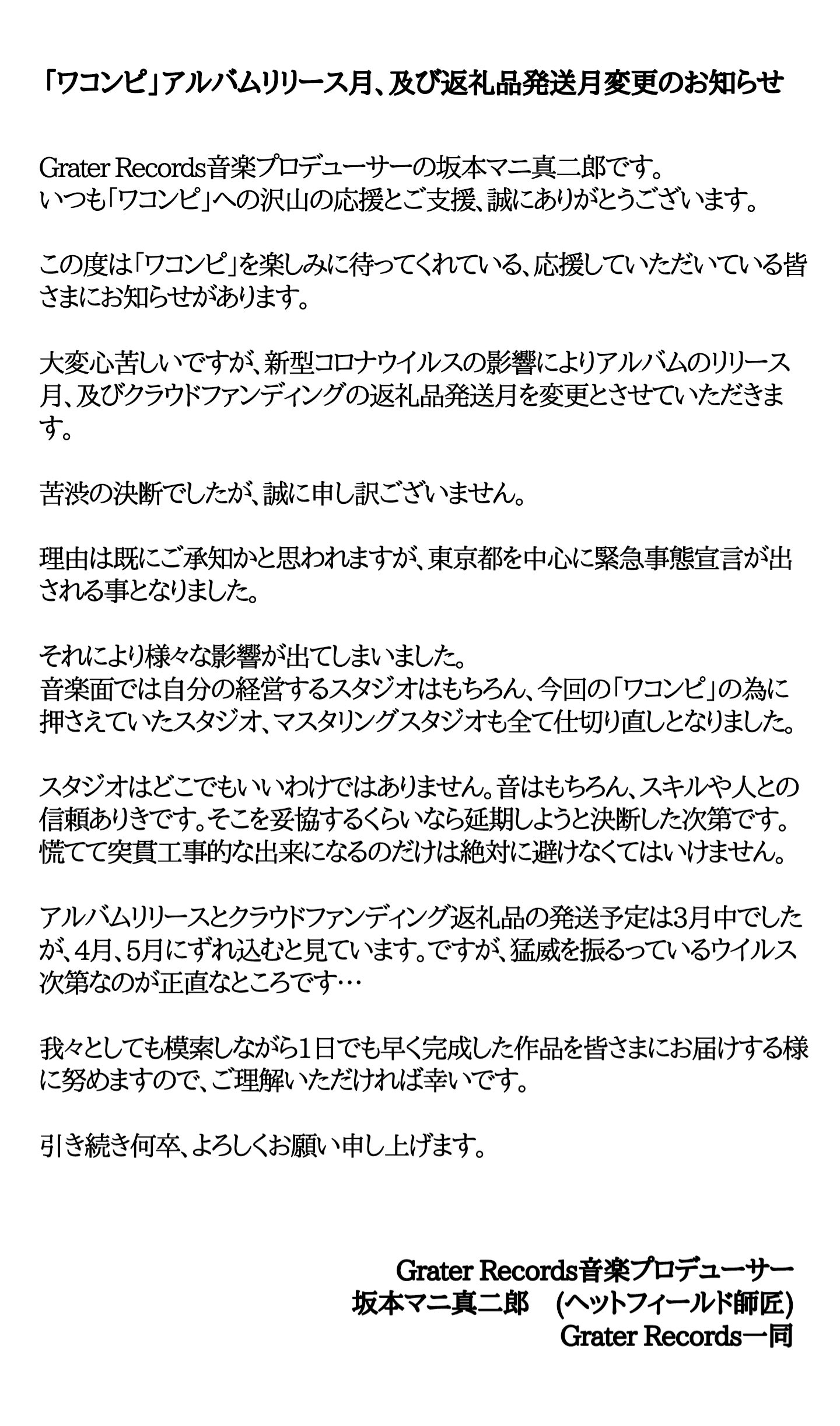 今朝Grater Recordsのオフィシャルツイッターより発表されましたが、3月中にリリース予定の「ワコンピ」は4月、5月のリリース予定となりました。
