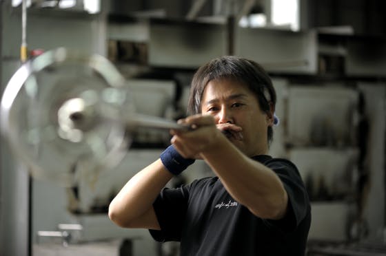 竿先へと伝える息吹と手に伝わる感覚を頼りに生地を作る吹き師と、砥石の振動や音に神経を研ぎ澄ませて模様を施す切子師。