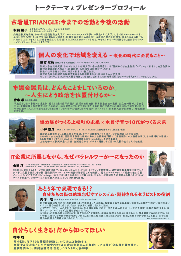 そして、そんな長野に住む10代・20代の若い世代に、これからの未来をいきいきと楽しく生きてほしい!地域で活動する多くのプレイヤーの生の声を聴いてもらい、これからの自分の生き方を考えるためのきっかけにしてほしい!