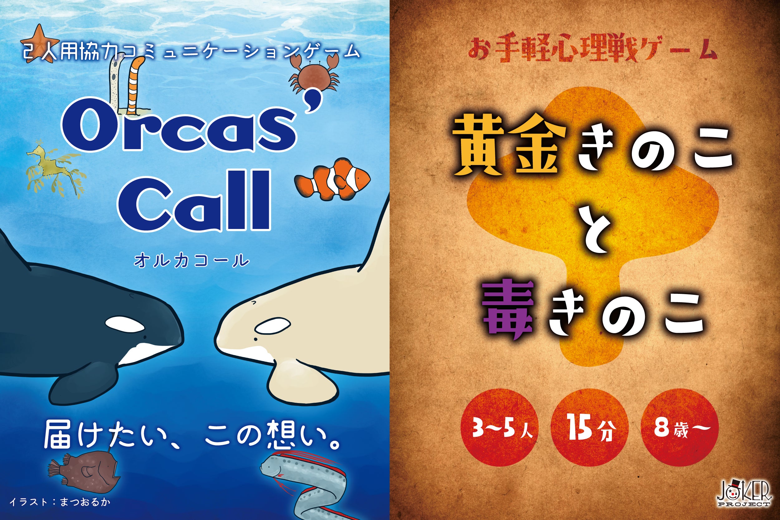 新作ボードゲーム2種類『黄金きのこと毒きのこ』『Orcas' Call(オルカコール)』と、オリジナルプレイマット(600mm×350mm)、Thanksメールの数量限定セットです。