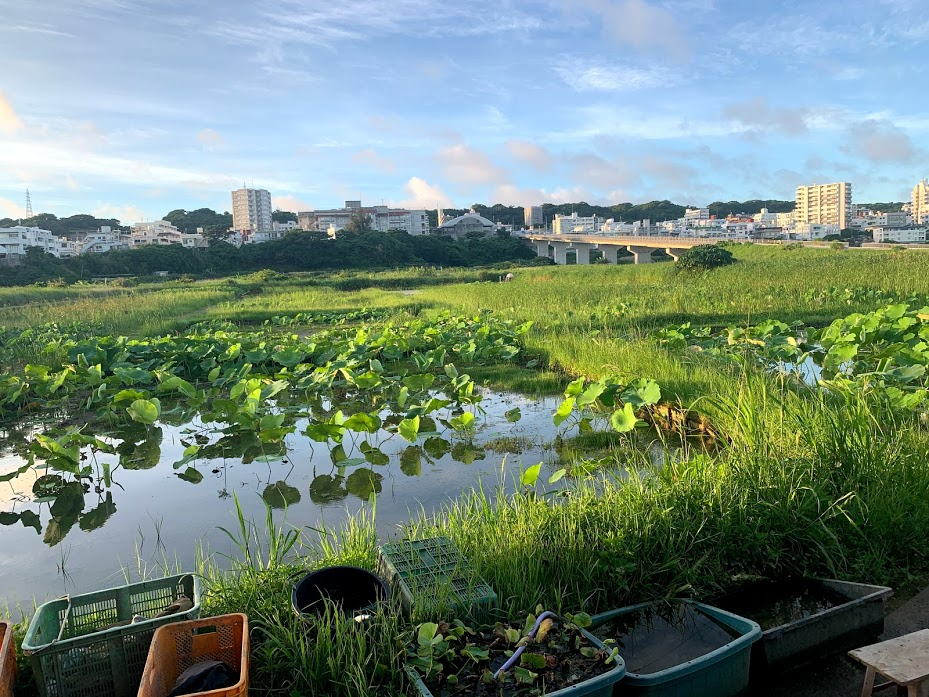 私たちがれんこん畑をやっている沖縄県の宜野湾市大山(那覇空港から車30分)という地域は、琉球王朝時代は稲作、戦後は田芋(ターム)栽培が盛んな水が豊かな場所です。