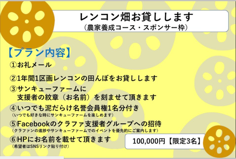 リターンF:れんこん畑お貸しします(農家養成コース・スポンサー枠)【3組限定】100,000円