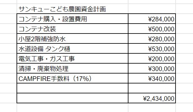 ※上記資金のうち、All-in方式で集まった資金を利用させて頂きます。不足分に関しては、実行最低限資金をプロジェクトメンバーで負担し資金如何に関わらず、サンキューこども農園プロジェクトは実施継続させて頂きます。