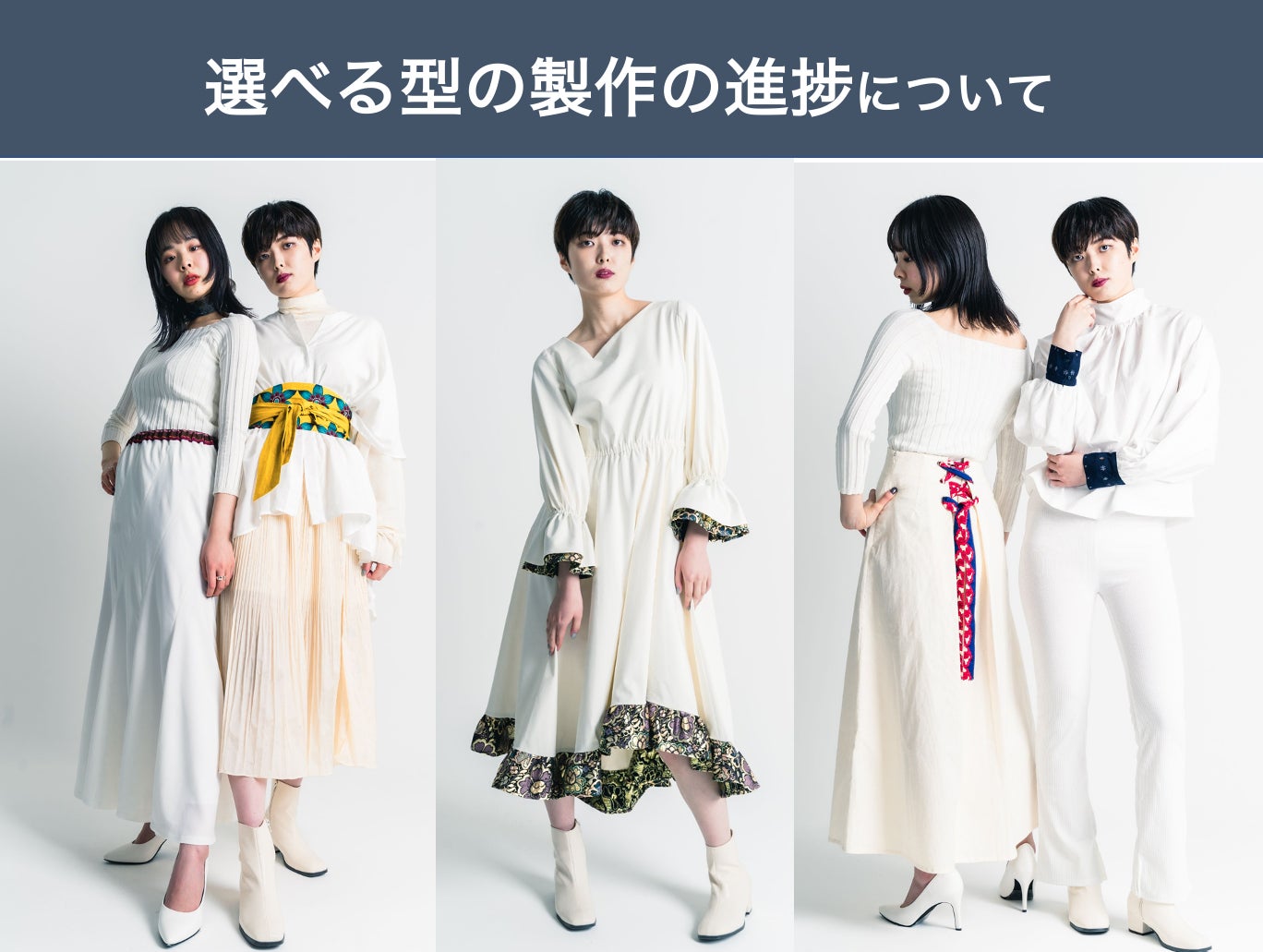 今回の一般受注開始時に公開するのは、選べる型vol.1の5型に加え、選べる型vol.2は、ロングガウン、ジャケット、パンツ、ワンピース、ユニセックスシャツの5型になります。
