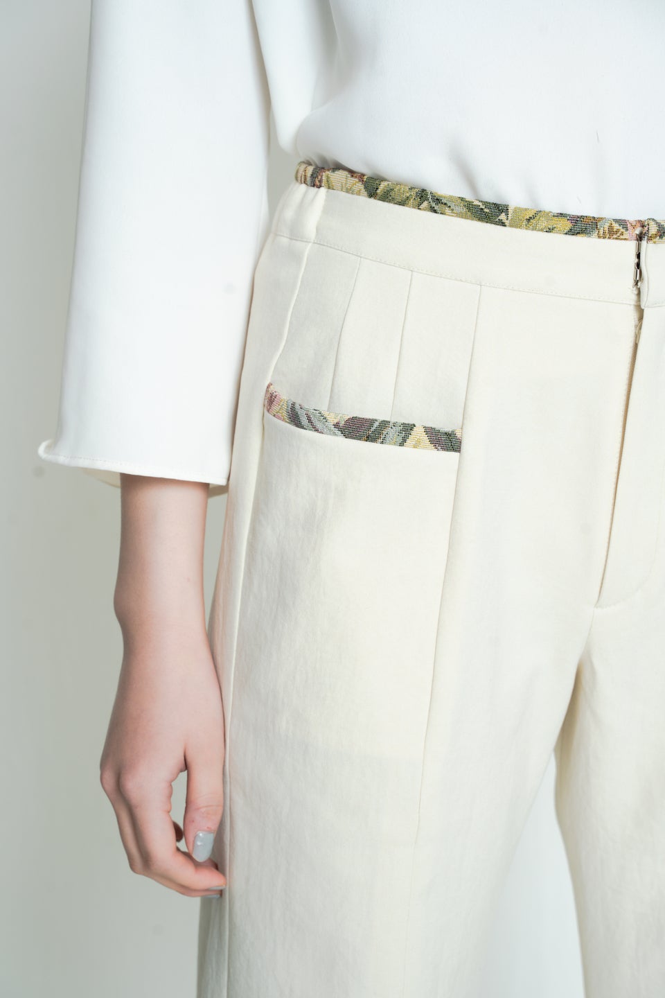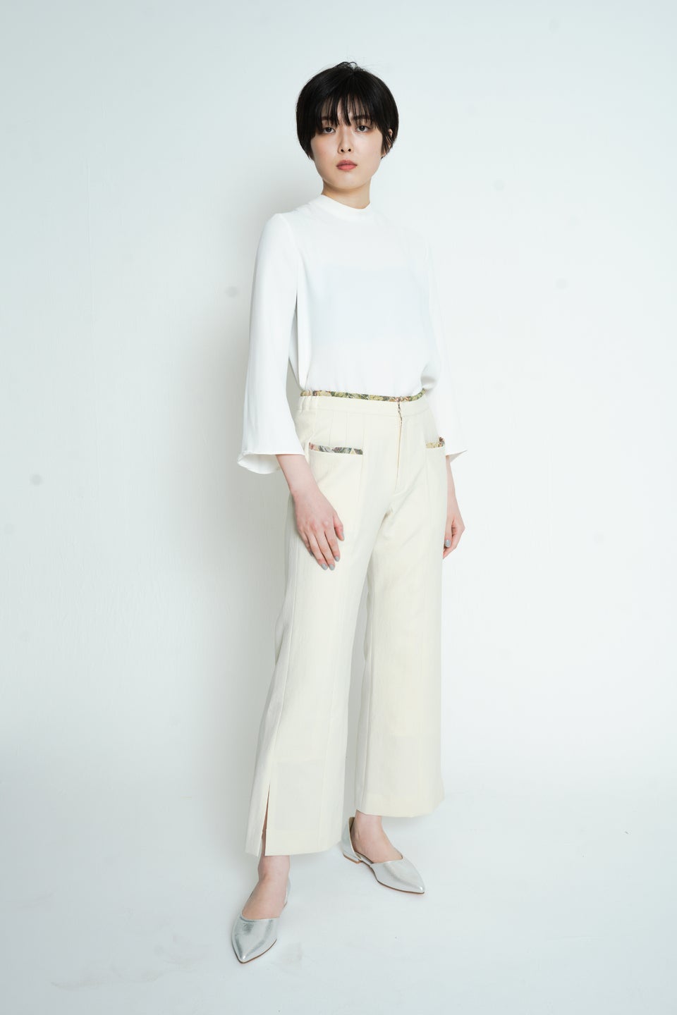 世界素材をライン状にさりげなく取り入れたスリット入りのワイドパンツ。