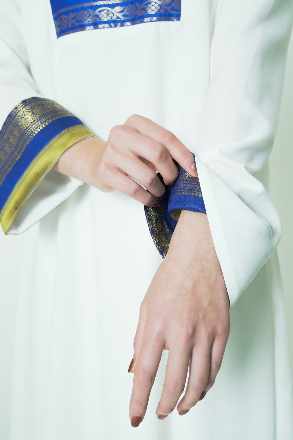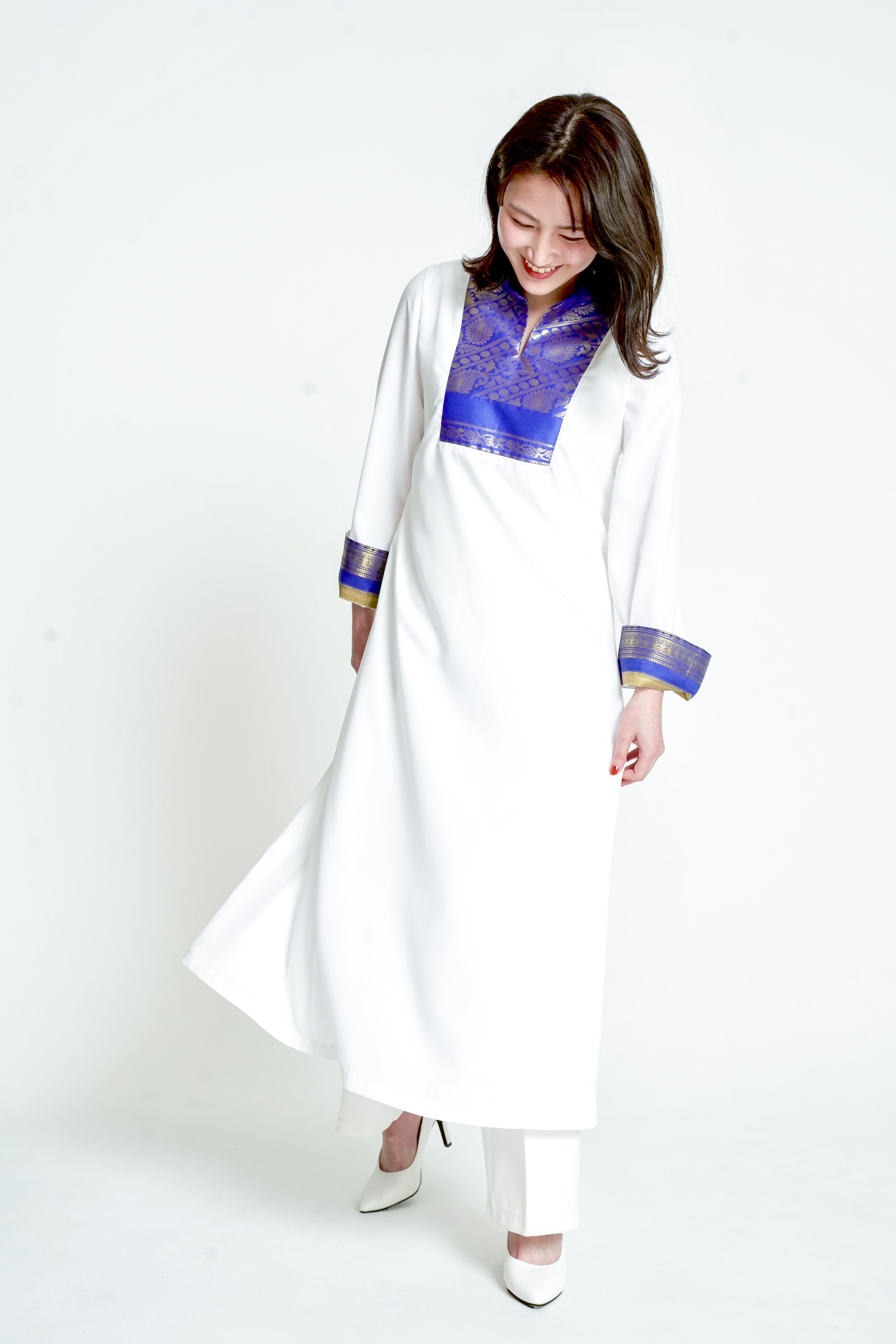 胸元と袖の内側に世界素材が入ったロングワンピース。