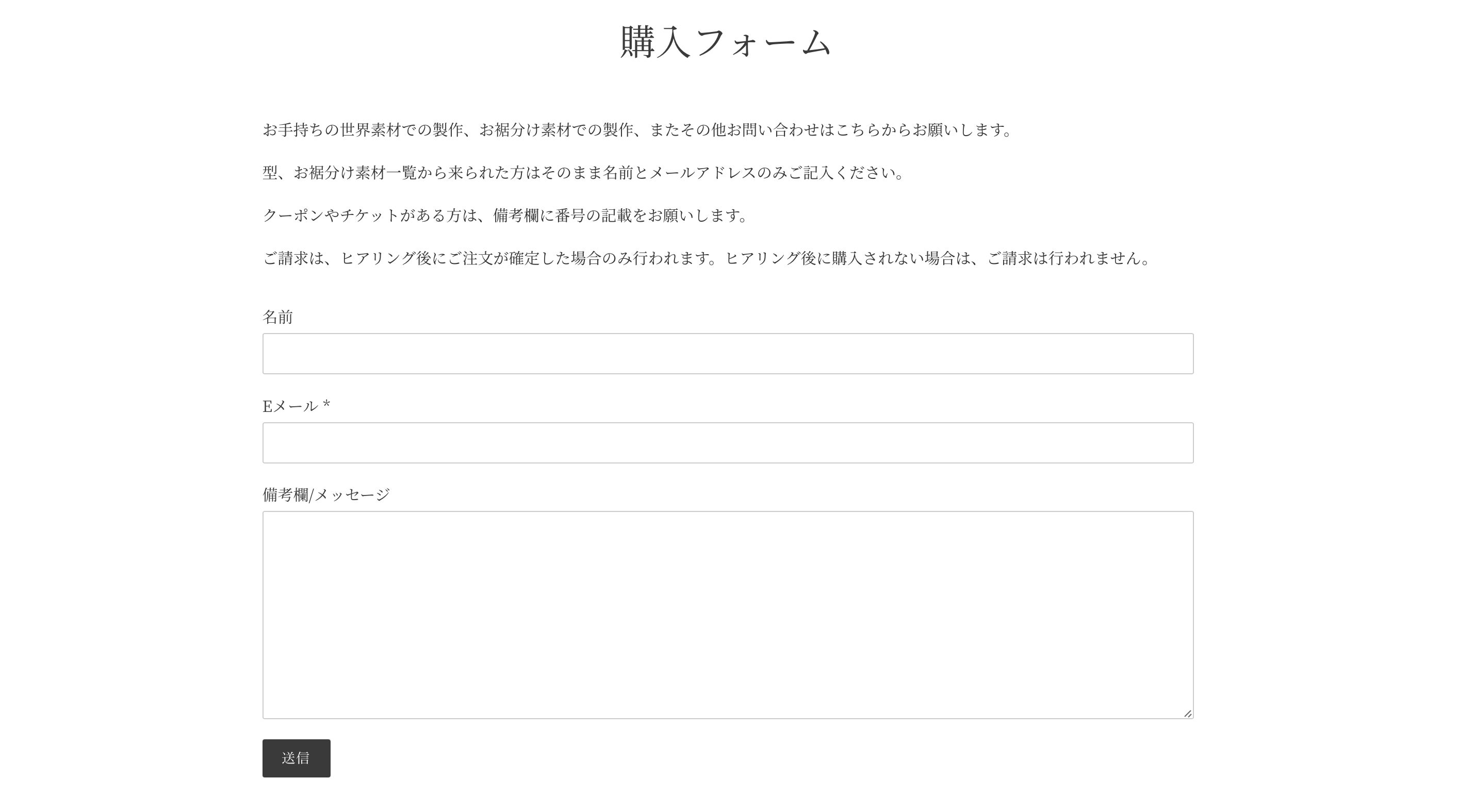 2)お裾分けの世界素材は、「製作フォームへ」のボタンから購入フォームに進むため、必要事項を記入して送信する。