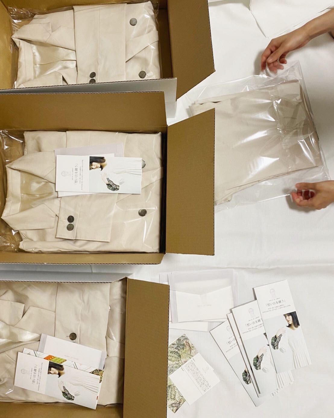 梱包には、ご注文いただいたお洋服の他に、パンフレットや想い出カードも同封しております。