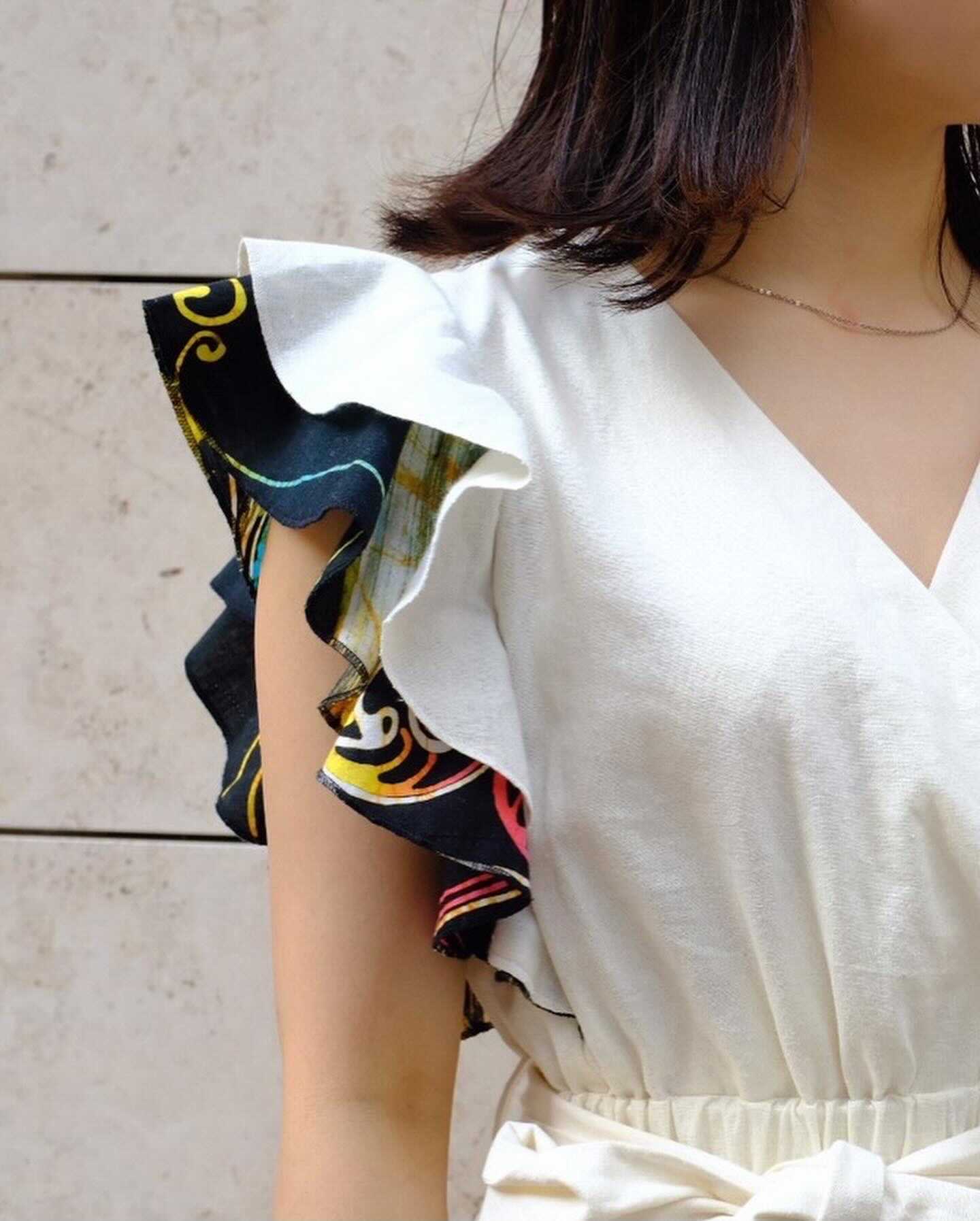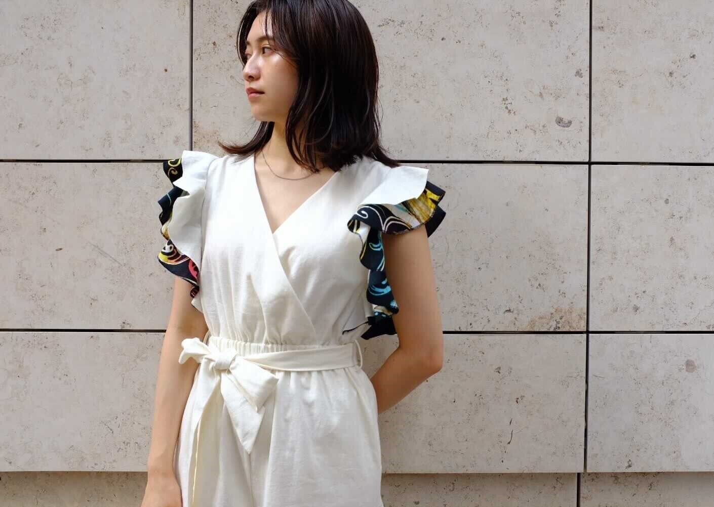 ダブルフリル袖の下フリル部分に、大胆に柄生地を使ったオールインワン。