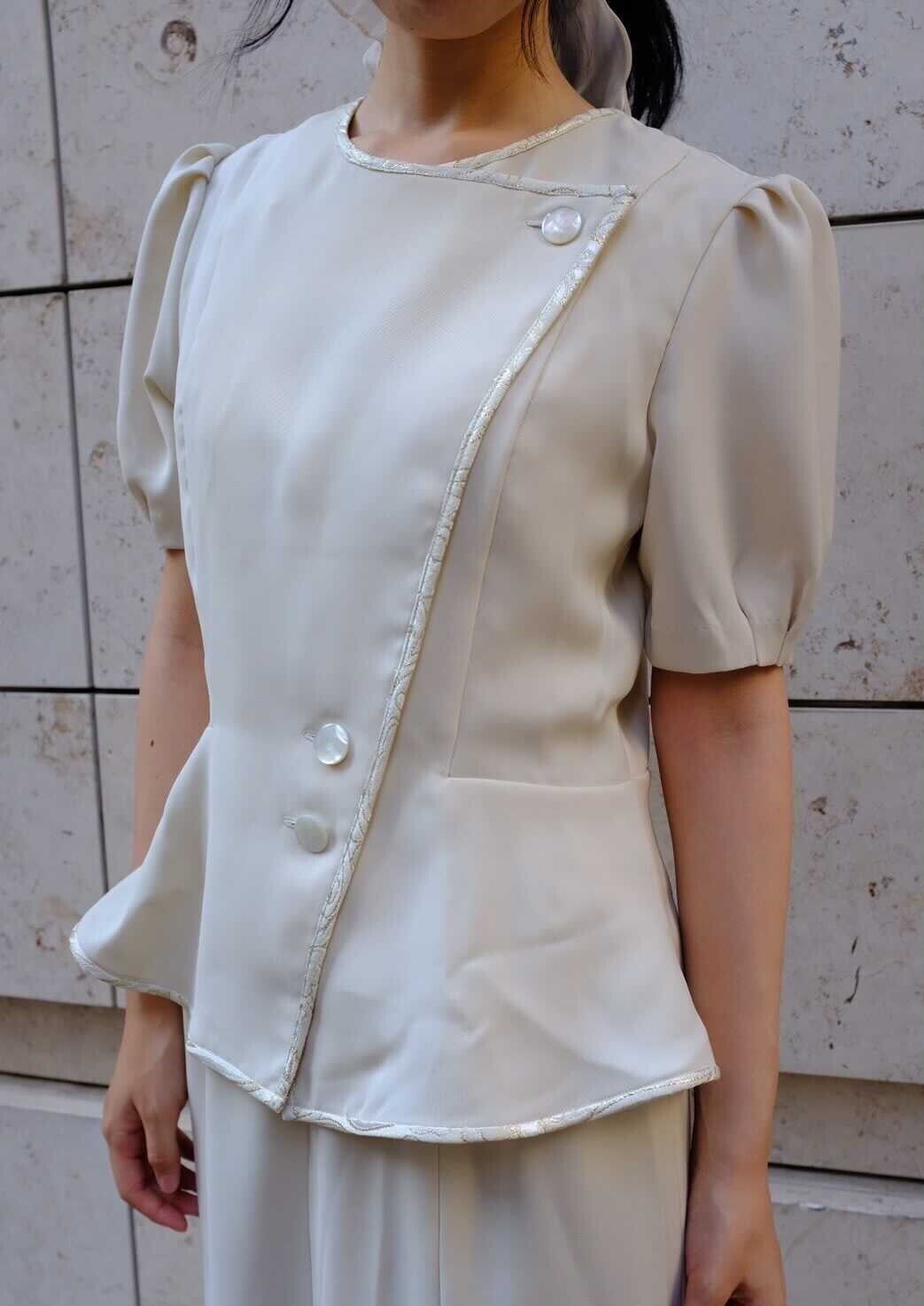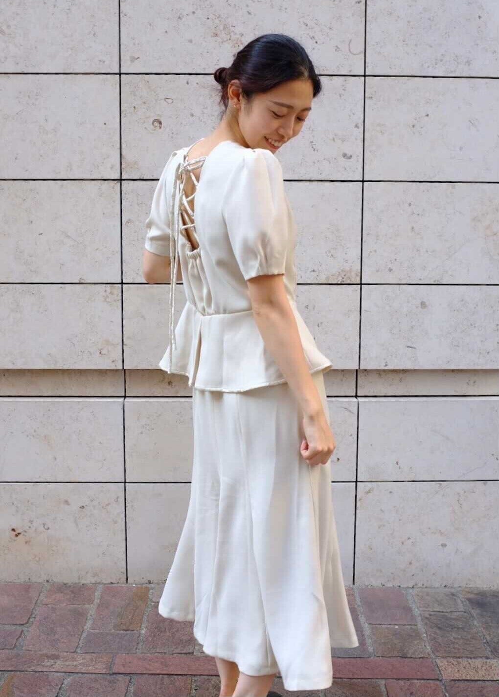 パフスリーブ袖やスカートのフレア感は、女性らしいエレガントさを演出するデザインです。