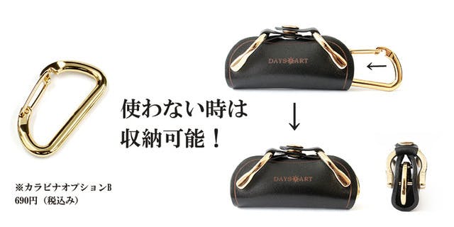Aと同様でキーケースに収納可能。スペースはとりますが、ベルトループへの脱着が一番簡単なカラビナオプションです。