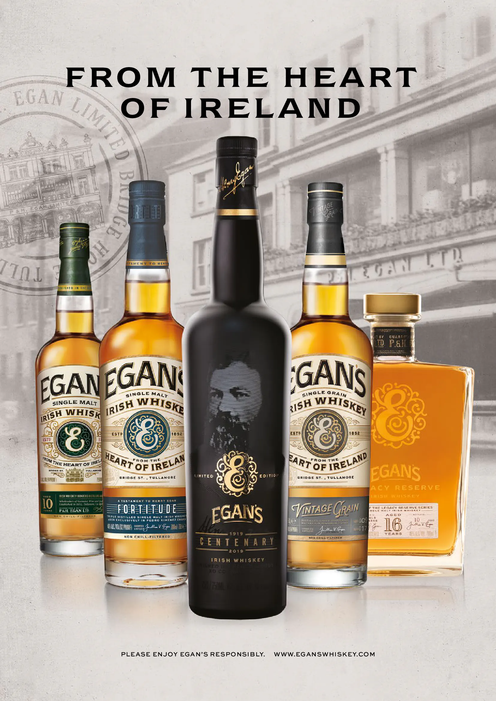 イーガンズ・ウイスキーはアイルランドの中心の街タラモア発のプレミアム・ウイスキーブランド。160年以上前にヘンリー&パトリックJr.・イーガンの兄弟によって創立されました。当時はアイルランドの高級ウイスキーの代名詞と言われるほどでしたが、時代の流れの中で1968年にいったんその歴史を閉じます。