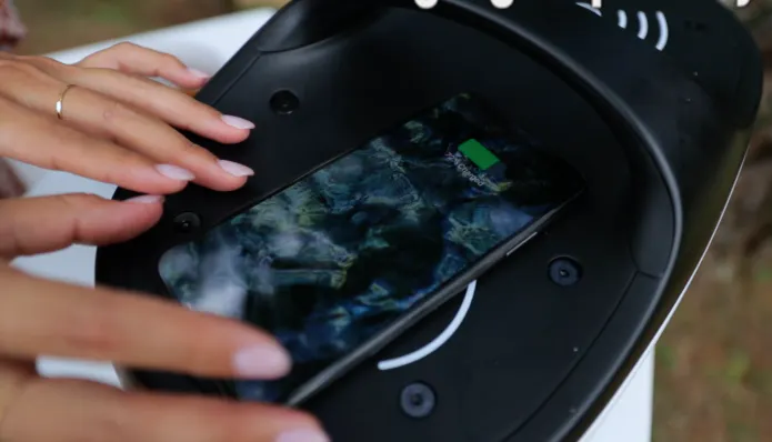 本体上部に2箇所のワイヤレスチャージャーを設置しました。スマートフォンでも、イヤホンでも、スマートウォッチでも、ワイヤレス充電対応機器を置くだけで充電できます。