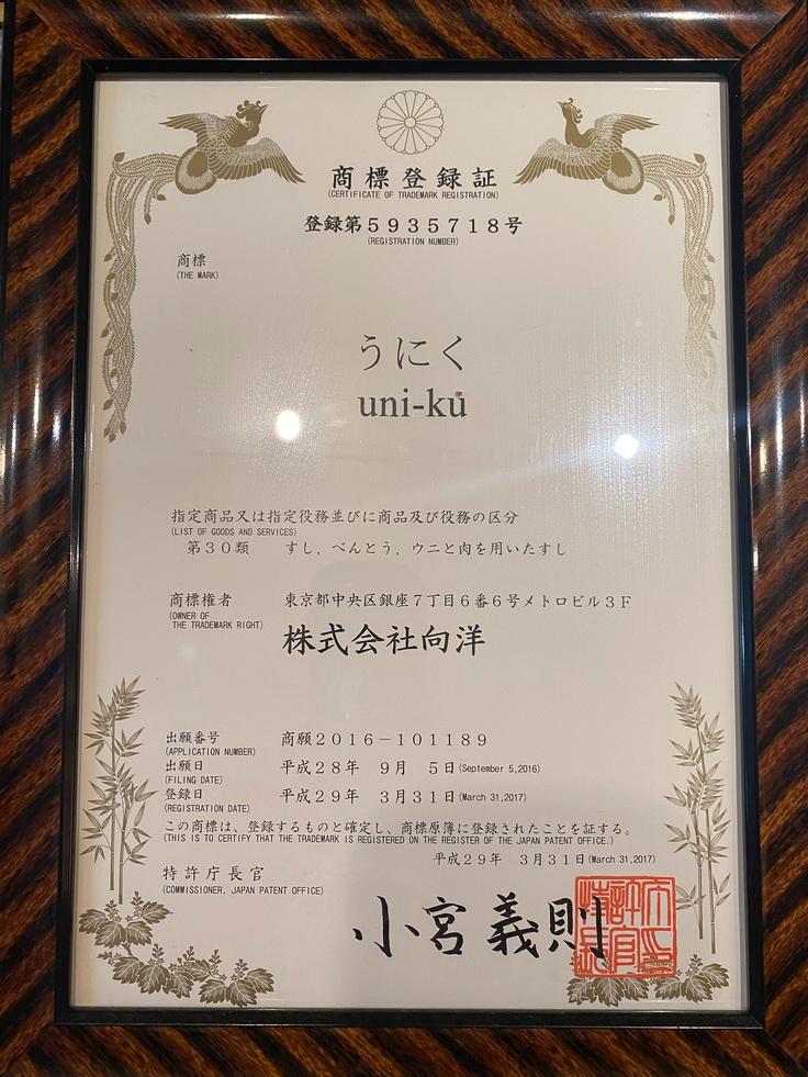 平成29年3月31日、当店名物「うにく」の商標を取得いたしました。