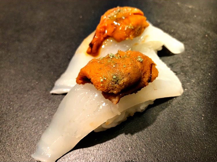 イカに北海道産生うにをあしらった握り
