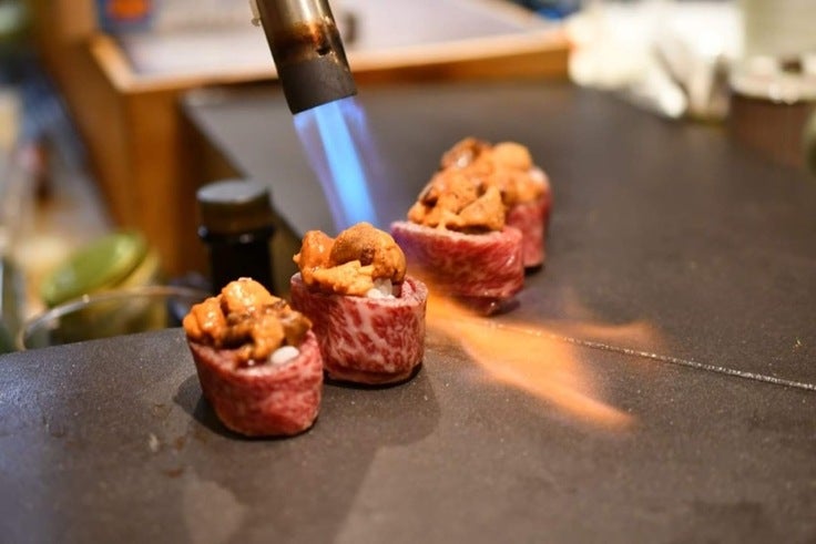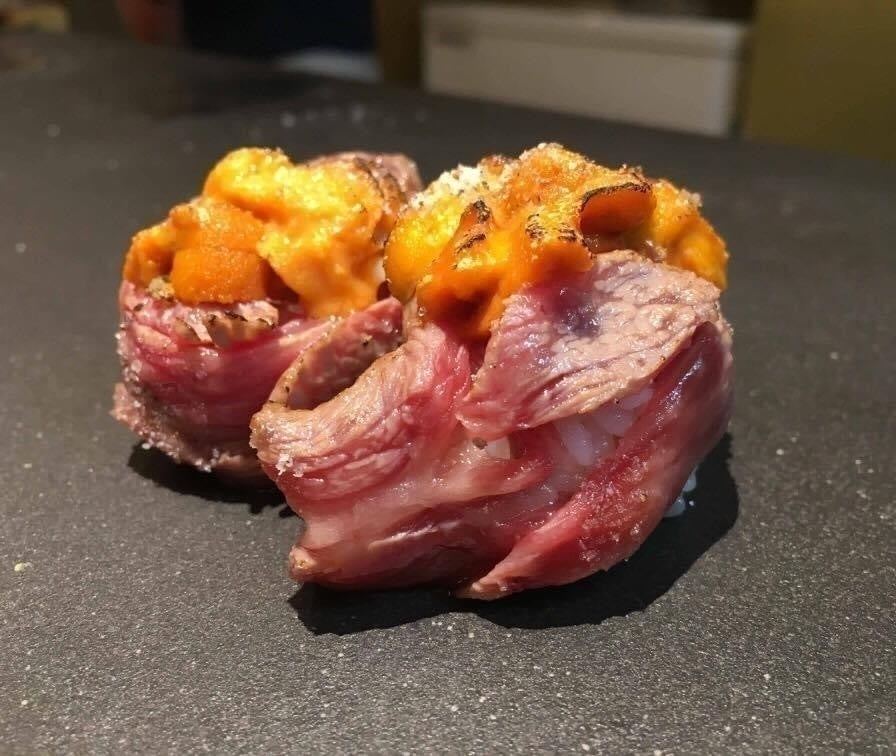 この商品は平成22年に門崎熟成肉で有名な「格之進」さんと、当店とのコラボイベントで門崎熟成肉で軍艦を作り、生うにをのせた寿司を開発。