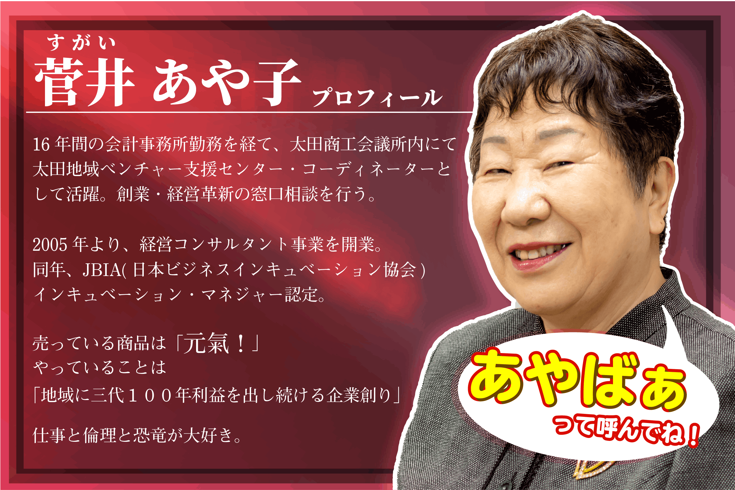 初めまして、インキュベーション・マネージャー、コンサルタントの菅井あや子です。