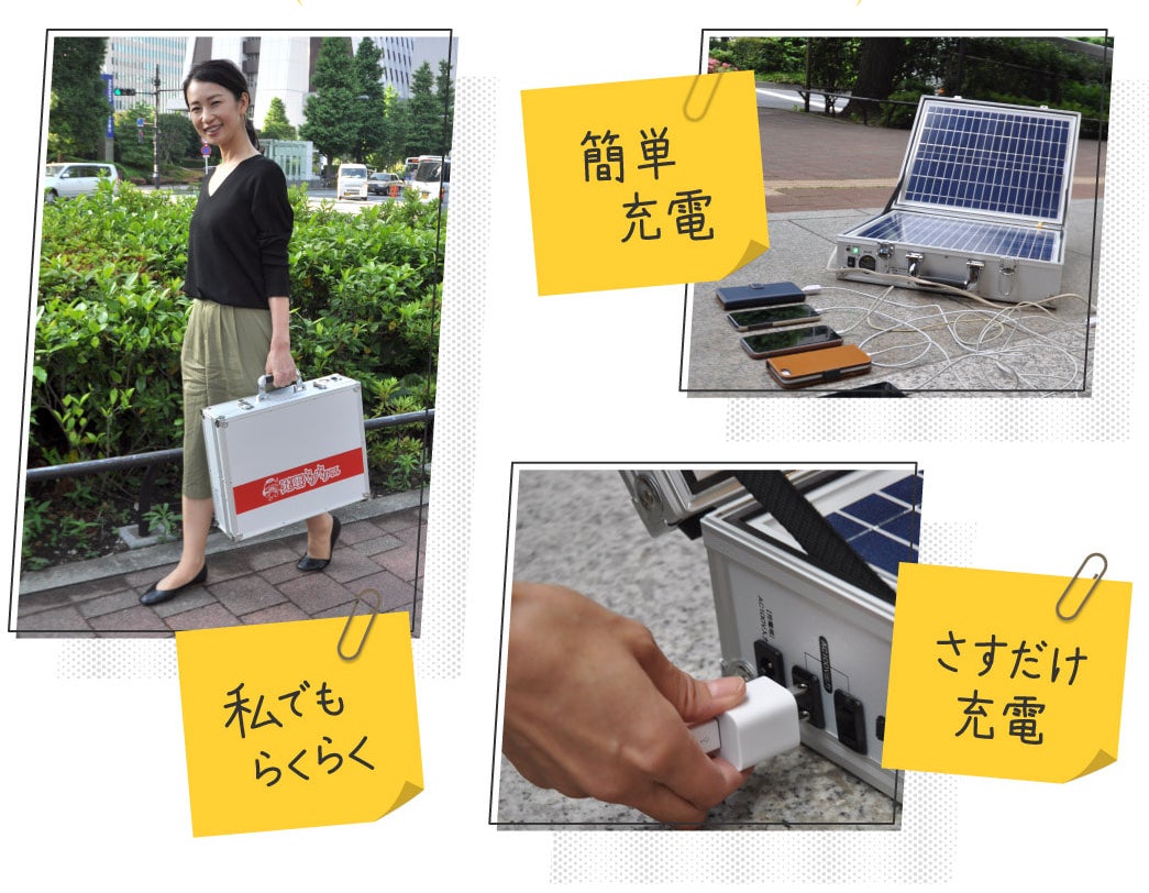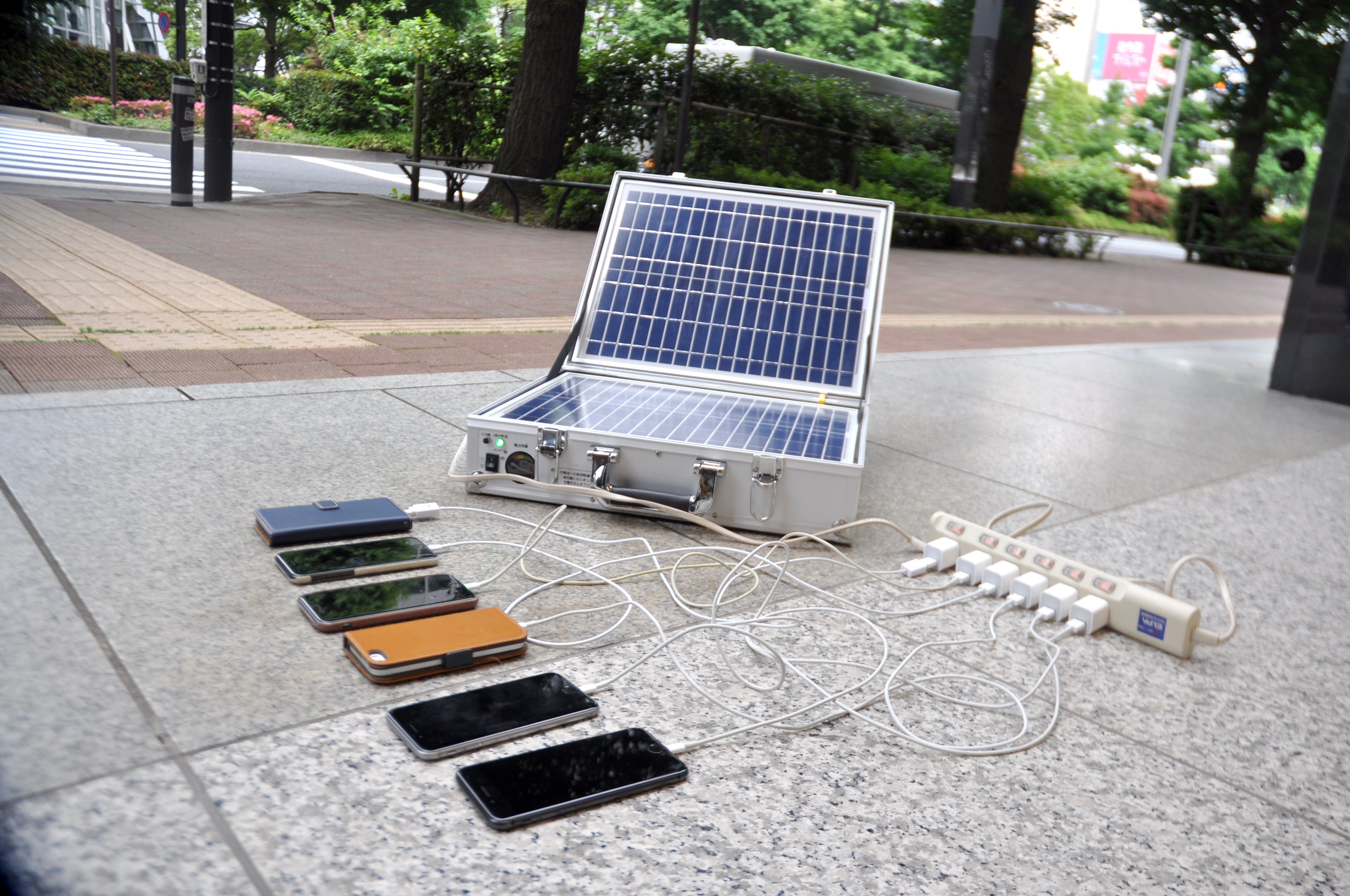 アタッシュケースを開き、ソーラーパネルで太陽光発電をしながら使用することも可能(晴天時約12時間でフル充電)で、満充電の場合、スマートフォン25台分をフル充電できます。
