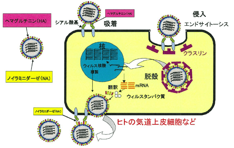 インフルエンザウイルスの外側にある、ヘマグルチニン(HA)が細胞膜に吸着し、細胞内へ侵入・脱殻し、さらに遺伝子の転写及び子孫ウイルスの放出などを行い発症します。