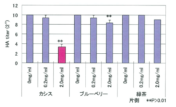 - 結果:上記のグラフより、カシスエキスにはインフルエンザウイルスによる鶏赤血球の強い凝集阻害活性が認められたことから、ウイルスは赤血球に吸着(感染)できないことが示唆されました。これはポリフェノール含有量がほぼ同等な緑茶抽出物やアントシアニン含量が同等なブルーベリーエキスと比べても強かった。このことからカシスエキスに含まれる成分はインフルエンザウイルスに対して、有効な食品素材であることが示唆されます。