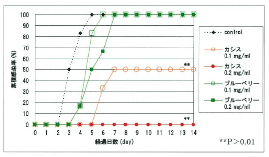 - 結果:発症率においては、サンプル非投与群では3日目以降に発症を認め4日後にはすべて発症しました。ブルーベリーエキスは低及び高の両投与群において4日以降に発症が見られたため、サンプル非投与群との間に有意差はありませんでした。一方、カシスエキスは低投与群6日目において半数に発症を確認し、また高投与群では、試験期間内で発症は見られませんでした。そのため、両社ともサンプル非投与群との間で有意差が確認できました。