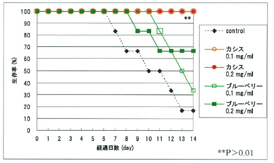 - 生存率においては、サンプル投与群では7日目から死亡が確認でき、14日目では80%以上の個体が死亡しました。ブルーベリーエキス投与群では9日ないし11日目から死亡が確認でき、14日目には低投与群で約65%、高投与群で30%を超える個体の死亡を確認しました。しかし、カシスエキスでは低及び高投与群いずれも死亡が確認できませんでした。