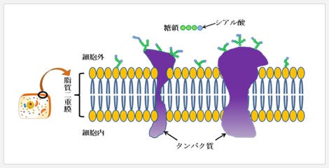 - シアル酸は通常、細胞膜の表面にある糖鎖の最も外側に存在しています。このように細胞の最も外側に位置することから、細胞間の情報伝達や、インフルエンザ等の病原体の認識に関与していると考えられています。
