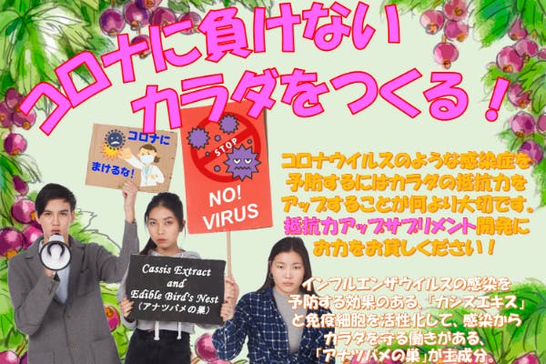 今回、開発をしようとしているサプリメントはインフルエンザウイルスに対して感染リスクを下げる効果がある「カシスエキス」と免疫細胞によるウイルスなどに対する貪食作用にシグナルを送るセンサー機能を強化する作用のある「アナツバメの巣エキス(シアル酸)」を主成分とした抵抗力維持を目的としたサプリメントです。 -