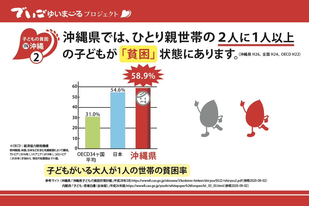 ひとり親世帯では更に状況は深刻です。沖縄県ではひとり親世帯の貧困率は約6割と高く、ひとり親世帯の2人に1人以上の子どもが「貧困」状態にあると言われています。