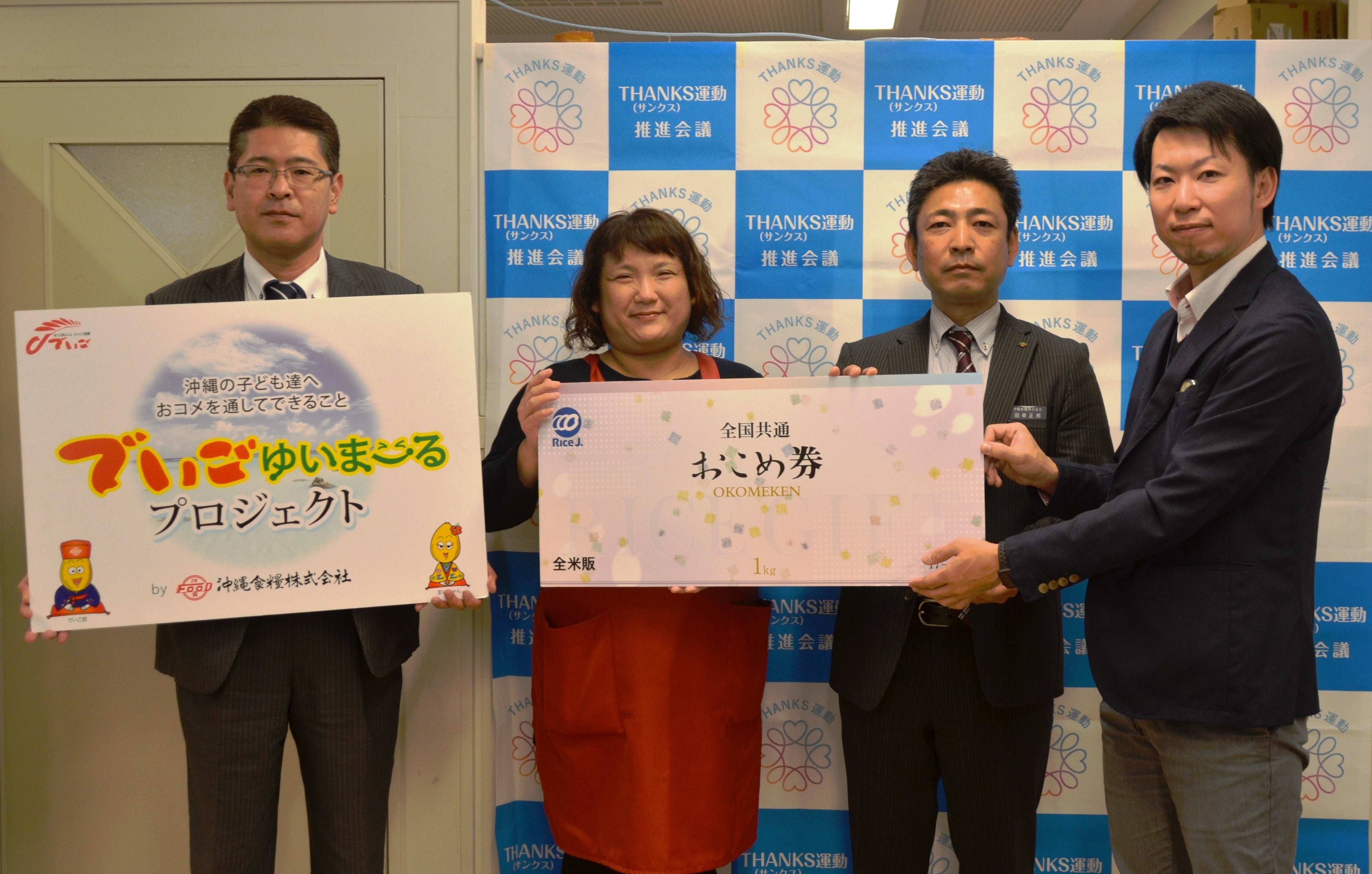 2021/02/24 18:56沖縄の子ども達が、美味しいごはんをたくさん食べて元気に育ってくれることを願い実施した、クラウドファンディング「でいごゆいまーるプロジェクト」で集まった支援金をおこめ券7,600枚に換え、108の子どもの居場所施設などへお渡しすることができました。2月17日に、その中の1団体である「地域むすびくらぶ」様へは直接お渡ししてきました。代表の方からは「沖縄には支援を必要としている子ども達がたくさんいる。必要な時に必要な食材を購入できるおこめ券はとても助かる」との声をいただきました。沖縄食糧はこれからも沖縄の子ども達への支援を継続していきたいと思います。 もっと見る