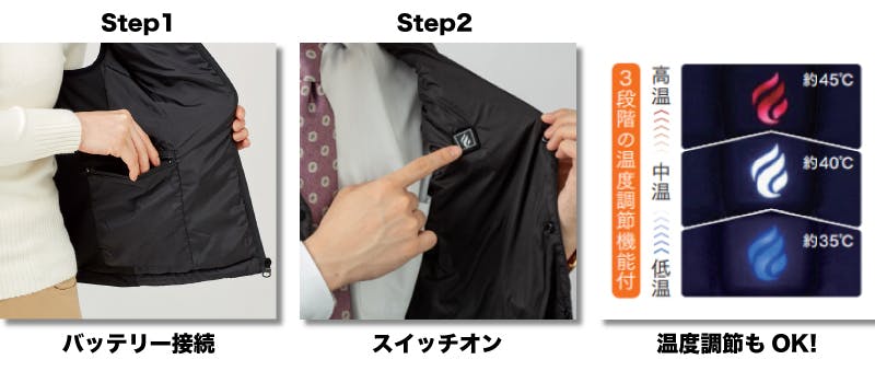 専用バッテリーを接続すれば、あとは左胸の内側にあるシークレットスイッチを押すだけですぐに発熱が始まり、温まります。