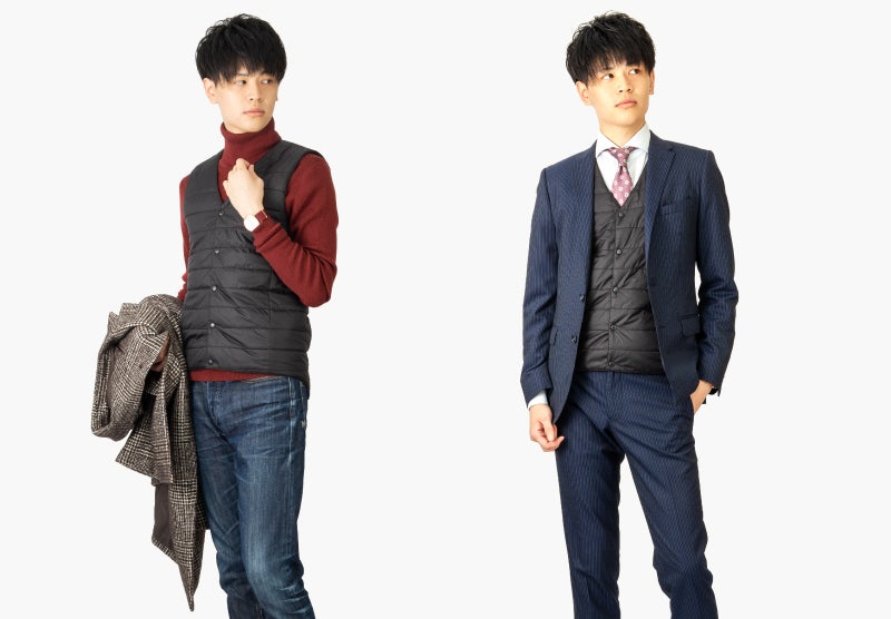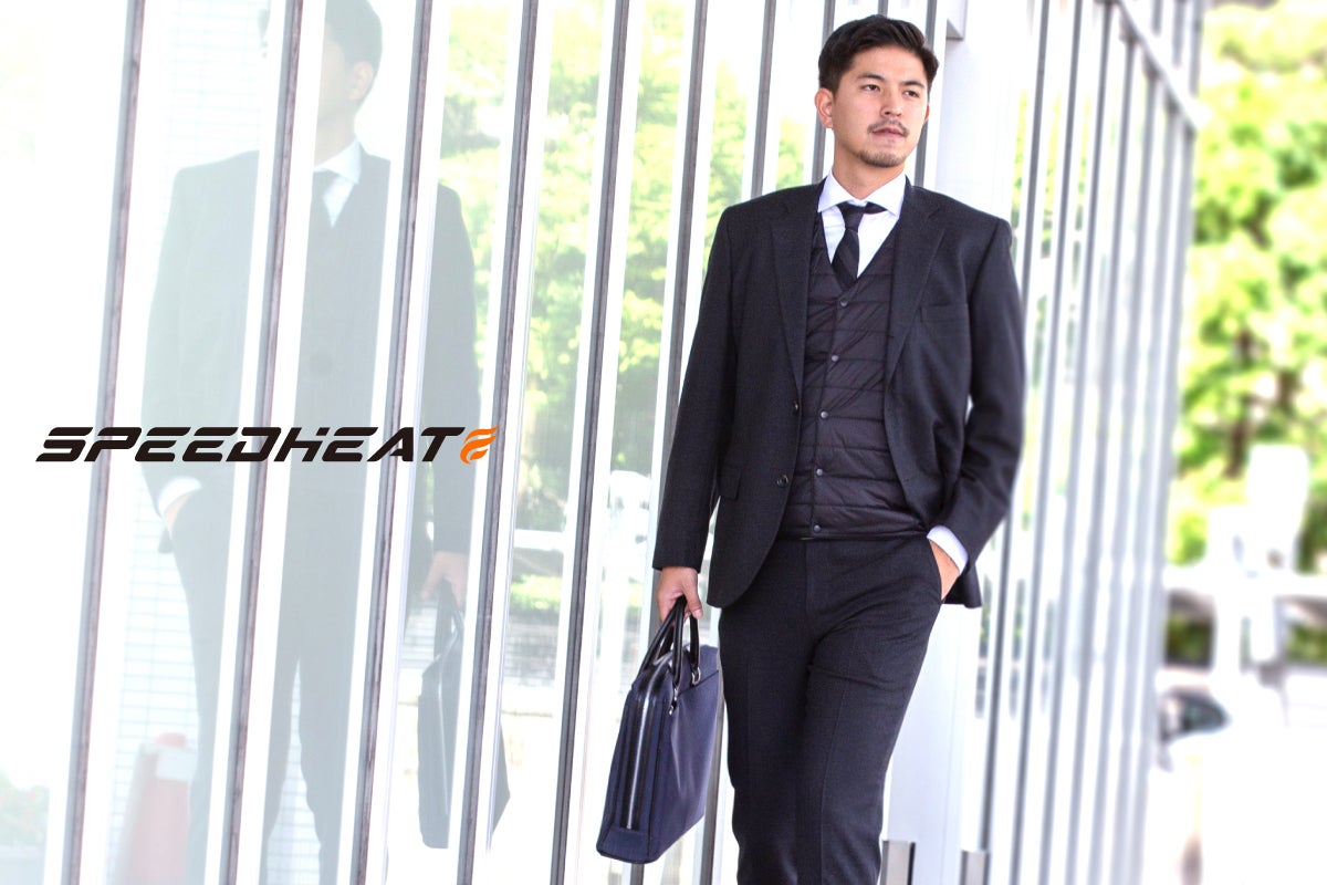 「スピードヒート」はスーツと合わせても着ぶくれせず、スタイリッシュなシルエットを維持しながら発熱による高い保温性能を実現しています。