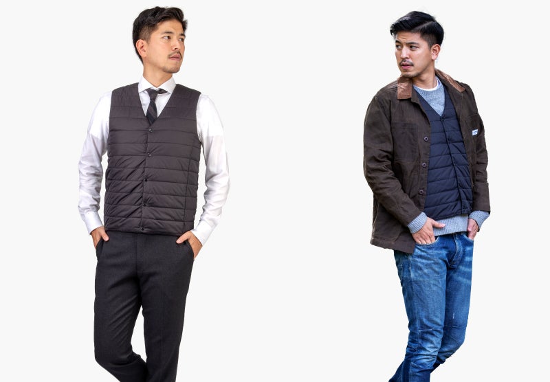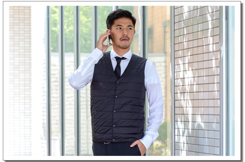 そこで、衿と胸元を大胆にカットしVネックのデザインに変更、ジャケットの下にも着用しやすくしたものが今回ご提案する「スピードヒート温熱Vネックベスト」となります。