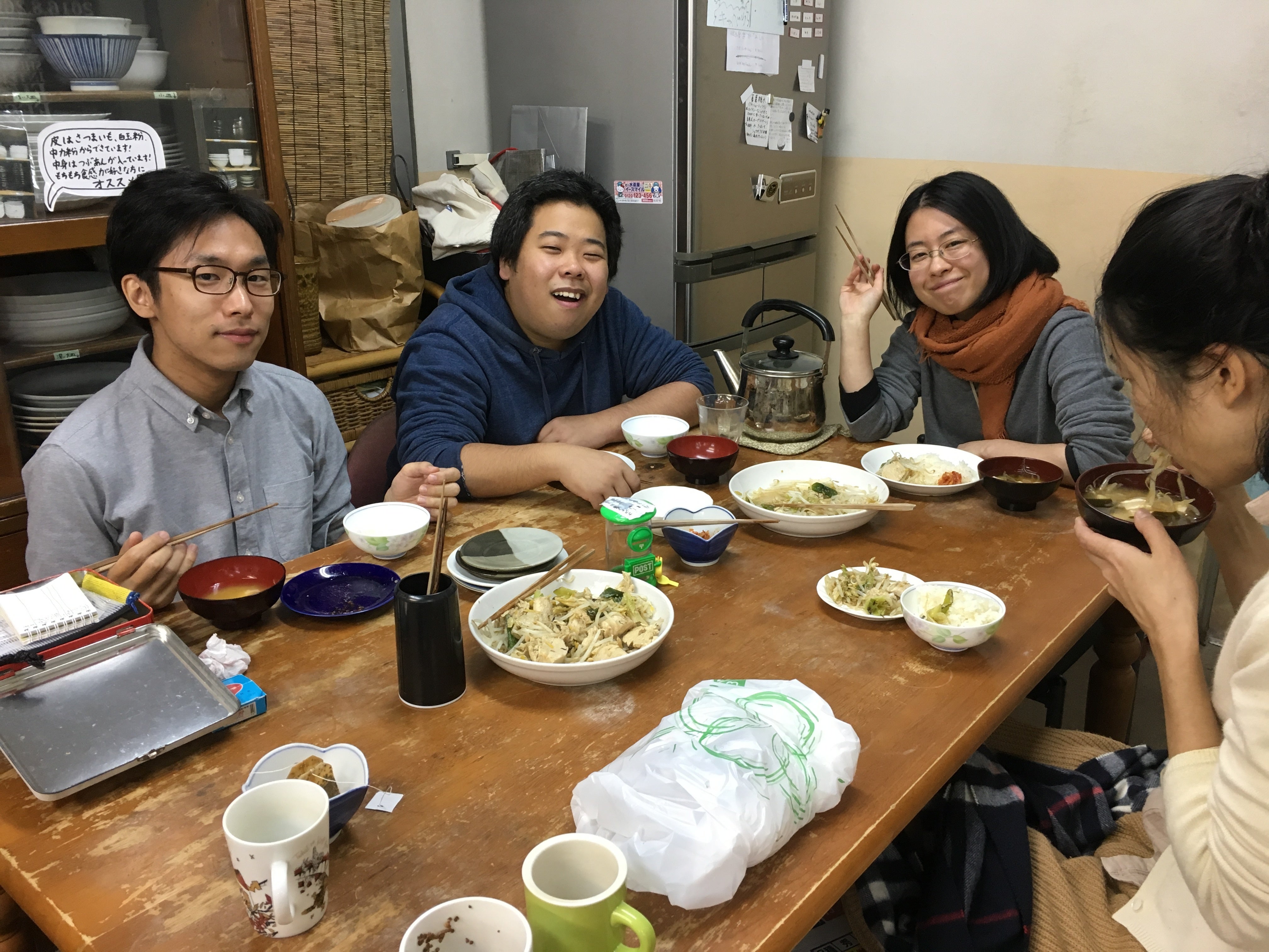 日々、様々な講座で学んだり、時にはイベントを催したりするには元気じゃないといけません。元気の源はやはり食べることです。TDUの前身であるオルタナティブ大学では週に3日、その日の担当シェフが腕をふるって夕食を作り、それをみんなでワイワイと食べていました。腹ペコという言葉から通称「ペコ」と呼ぶ夕食のシステムです。安価で栄養のあるご飯で大変助かります。また、料理をちょっとやってみたいという関心があれば調理担当見習い(?)になり先輩シェフに色々聞きながら、楽しく料理を覚えることも出来ます。