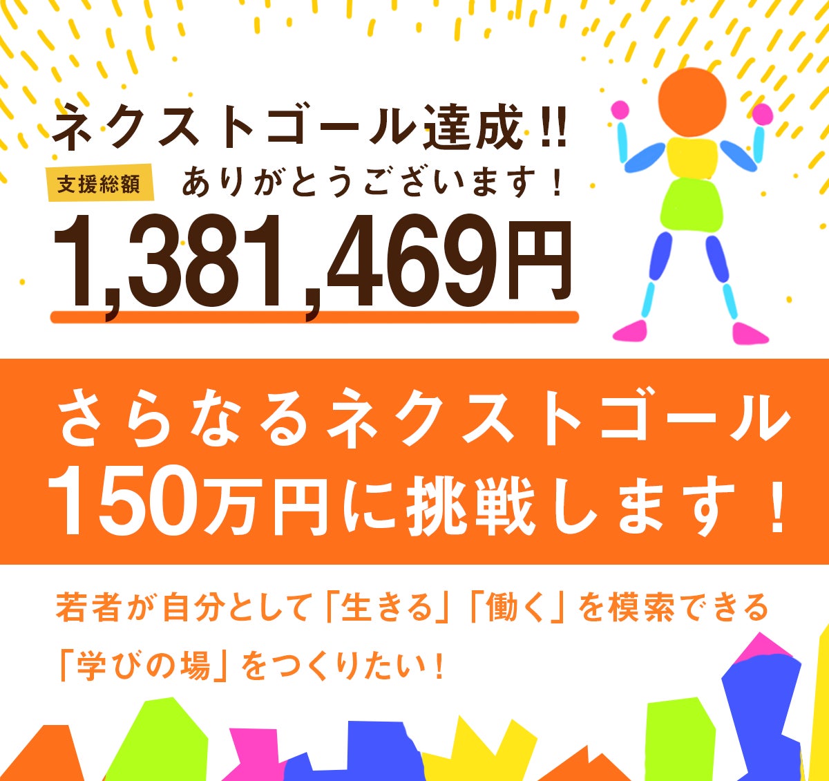 ここからは、ラストスパートです!てきせん大学での学びを下支えする書棚を始めとするさまざまな設備をさらに整え、経済的困難を抱える学生たちへの支援の枠も拡大していくために「さらなるネクストゴール」を150万円に設定し、クラウドファンディングが終わるその日まで、挑戦していきたいと思います!