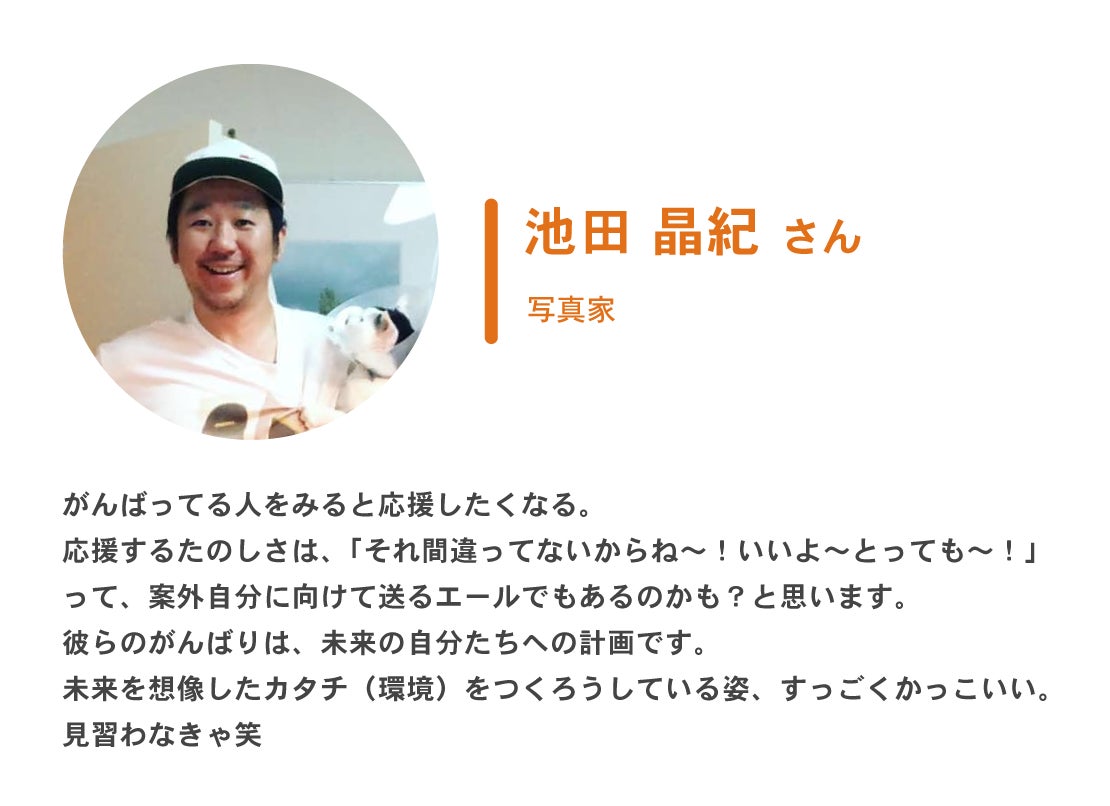 クラウドファンディング学生サポートチームです! クラウドファンディングのラストスパート中に立て続けに応援メッセージをいただいています!今日は写真家の池田晶紀さんからの応援です!池田晶紀さんには、前身のオルタナティブ大学時代から、映像の講座で話をしていただいたり、池田晶紀さんにリードしていただきながら、コラボ企画で写真を撮って東京都のTURNフェスで展示したり、お世話になっています。ご一緒させていただくたびに、とても勉強になる、なりよりわくわく楽しい時間を過ごさせていただいています!【池田 晶紀さんからのメッセージ】がんばってる人をみると応援したくなる。応援するたのしさは、「それ間違ってないからね~!いいよ~とっても~!」って、案外自分に向けて送るエールでもあるのかも?と思います。彼らのがんばりは、未来の自分たちへの計画です。未来を想像したカタチ(環境)をつくろうしている姿、すっごくかっこいい。見習わなきゃ笑-----------------------------若者たちが「生きる」「働く」を模索する新しい学びの場を良くするため、サードゴールに挑戦中(11/30まで!)! あと少しで達成できます!どうか、皆さまからの応援・拡散の最後の一押しをよろしくお願いします...!