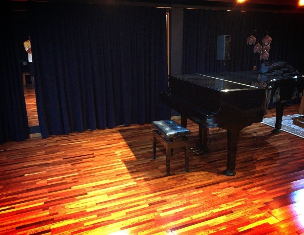 グランドピアノありの防音スタジオ。音楽関連の練習やリハーサル、こそっと練習などに。木目調が美しいフロアは広々70㎡以上でミニコンサートやライブなども可能な施設です。