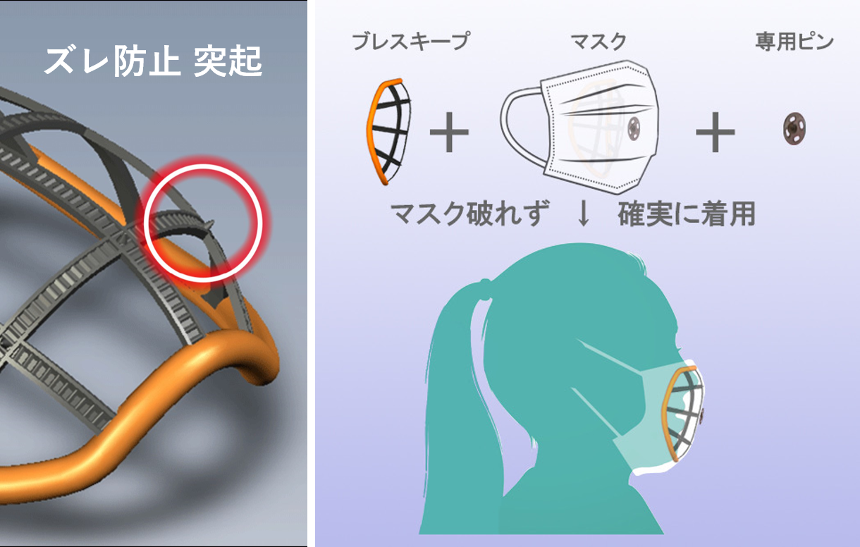 そこでマスク内部に空間を作ることを閃き、株式会社スリーエー様ご協力のもと開発したのが、この「ブレスキープ」です。