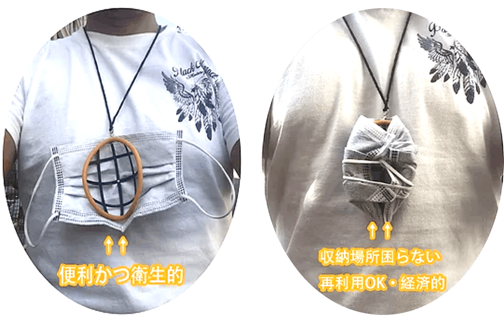 マスクを外した時は、付属のストラップを使って写真のように首にかけておくことができます。