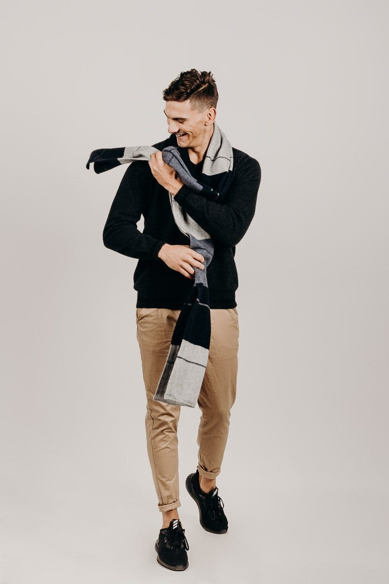 長めのスカーフなので、服装に合わせて、巻き方を自由自在にアレンジできます。スタイリッシュな色合いで、カジュアルにも使うことができます。
